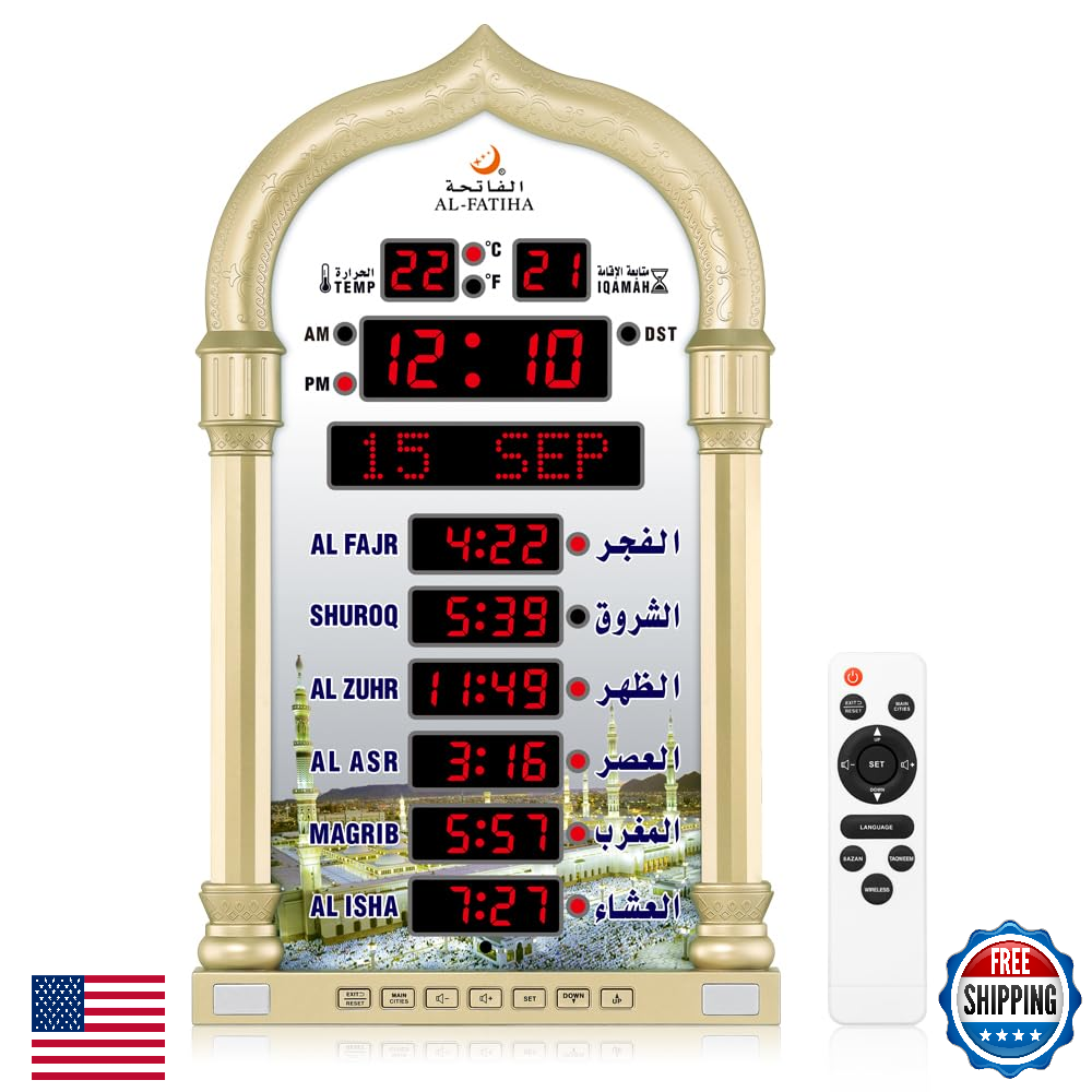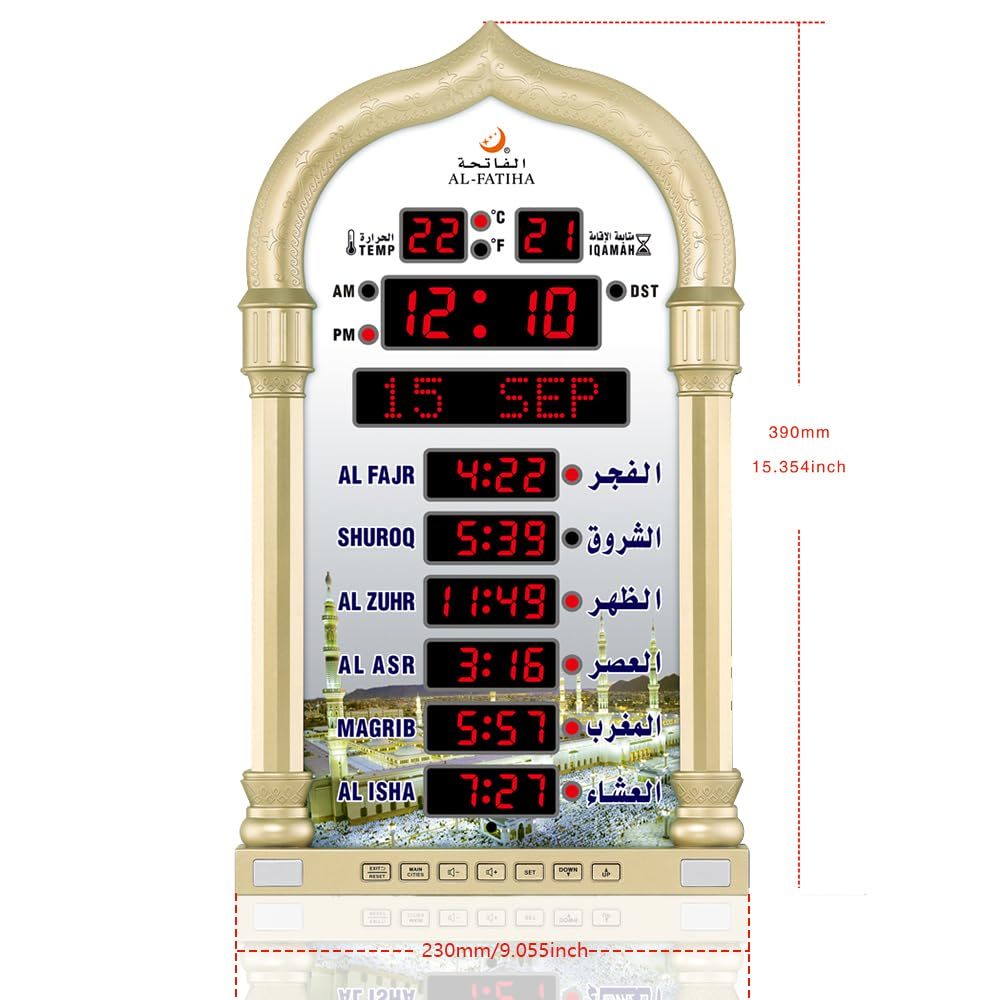 Prayer Reminder: 5 Azan Alarms, Azan clock with a high quality azan sound for all prayers with azan volume control fitted in all clock models.,City Setting Azan Taqweem Systems: Azan clocks help easily to set city by international dialing telephone code.,Date Setting Temprature Display: Use Hijr and Gregorian Calendar Setting and temperature reading in Celsius (C) is displayed.,Daily Alarm Weekend Alarm Setting: The daily alarm is a regular alarm that rings at the same time everyday. Moreover, this alarm can be set not to ring on weekends.,Perfect Gift: Full screen LED light Snooze option,Use for wall mounted or desktop decor, perfect Ramadan gift and New Year gift.Any questions about thia azan clock,please feel free to contact us.