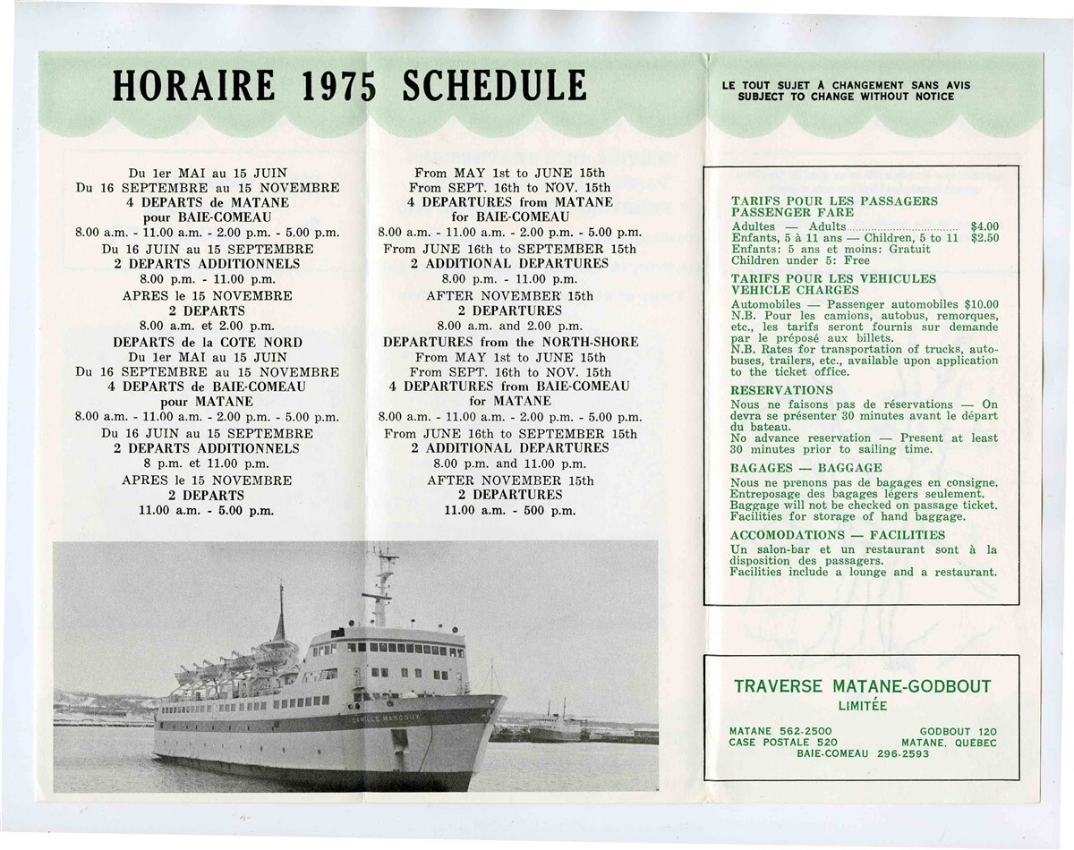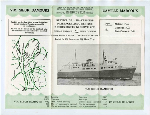 A well illustrated 6 panel fold out brochure in French and English. V M Sieur Damours and Camille Marcoux Brochure With information and schedules in 1975. Between Matane, Godbout and Bale Comeau PQ