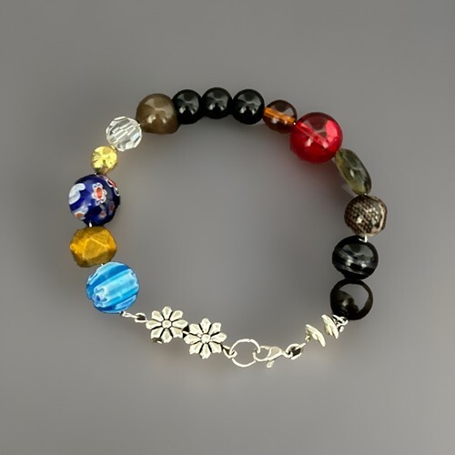 This multicoloured beaded wire bracelet with silver flower charms is a handmade piece of jewelry perfect for a festival vibe. The bracelet features a round shape with multicolor bead charms and a lobster closure. The wire chain adds a stylish touch while the silver flower charms give it a touch of elegance. This unique bracelet is sure to stand out and make a statement at any festival or event.