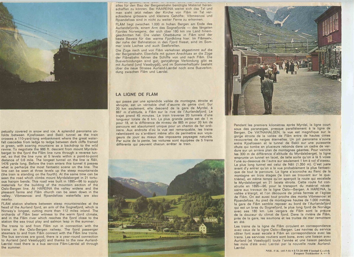 A 12 panel fold out in 3 languages.. Has creat color photos and a magnificent pictorial map. Flamsbana Norge Brochure Norway Flam Line Railway with Pictorial Map