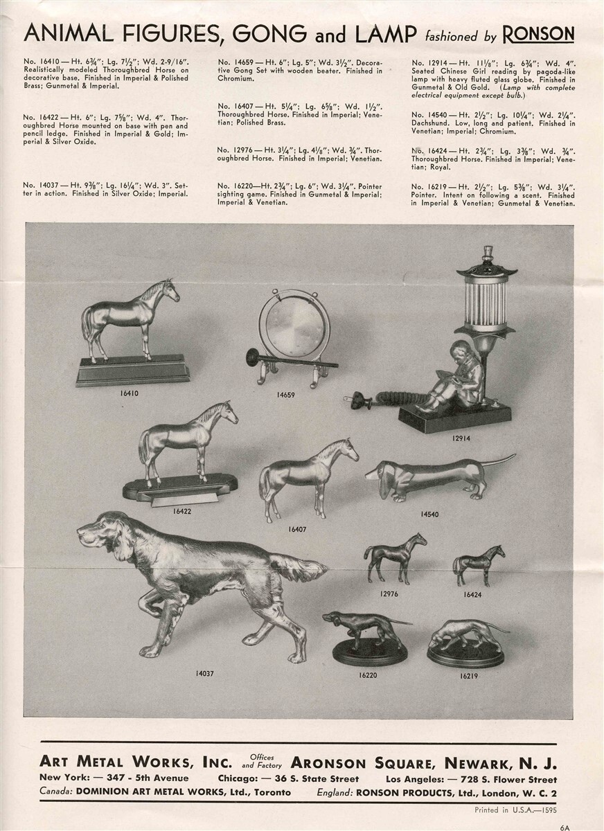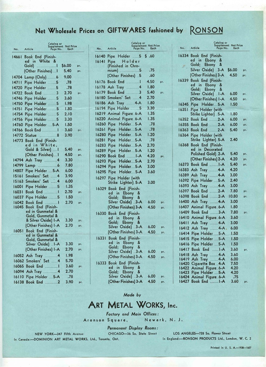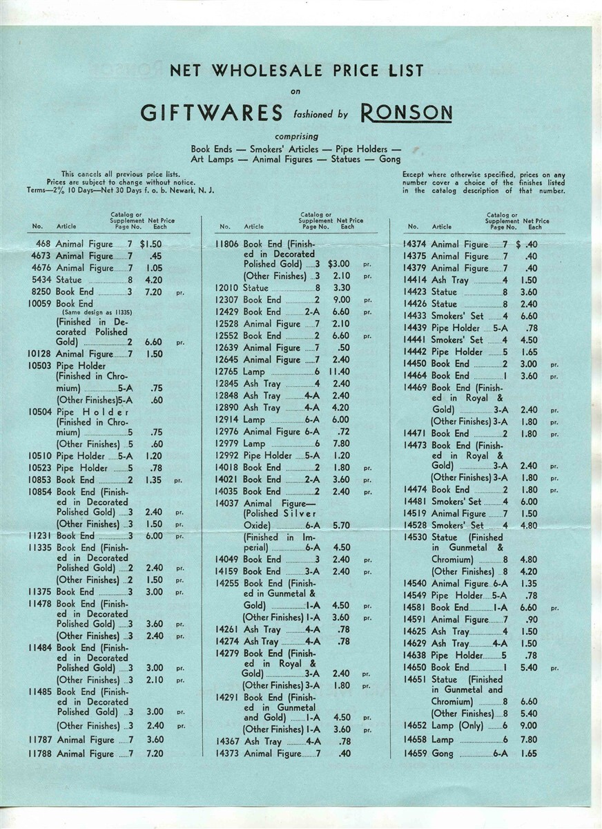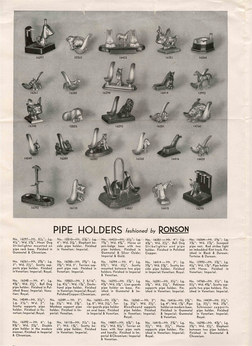 Ronson Giftwares Catalog Price List 1938 Bookends Pipe Holders Animal Figures
