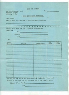 There are 3 Ronson items in this lot. A large well illustrated 6 page product catalog supplement of Book Ends, Animal Figurines, Pipe Holders and other smokers articles. Measures about 9" x 12" when closed. Lots of information on each item. Plus o2 sided single page price list for the items in the catalog. Dated 1938. And an unused single page Order Form.