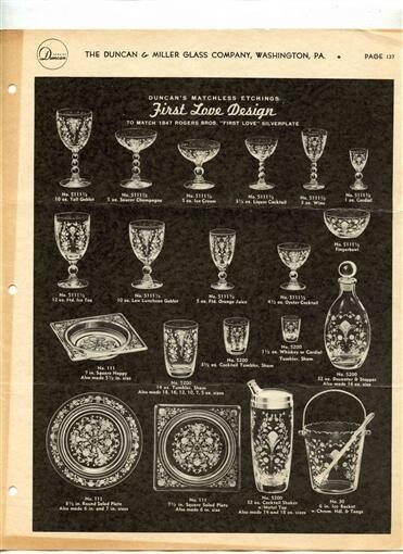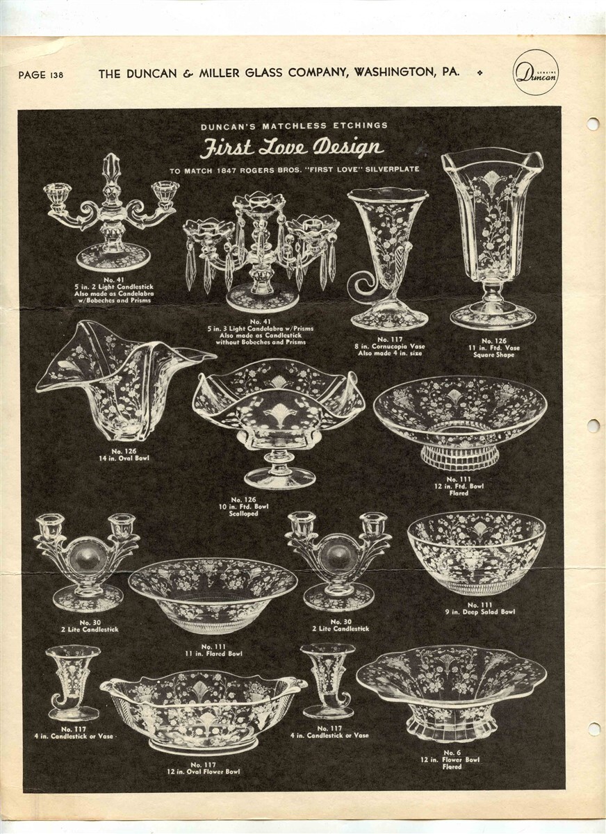 4 large pages of images and information of decorated fancy glass items. Duncan Miller Glass Company of Washington Pennsylvania. Duncan's Matchless Etchings First Line Design to Match 1847 Rogers Bros First Love Silverplate Photos 1930's