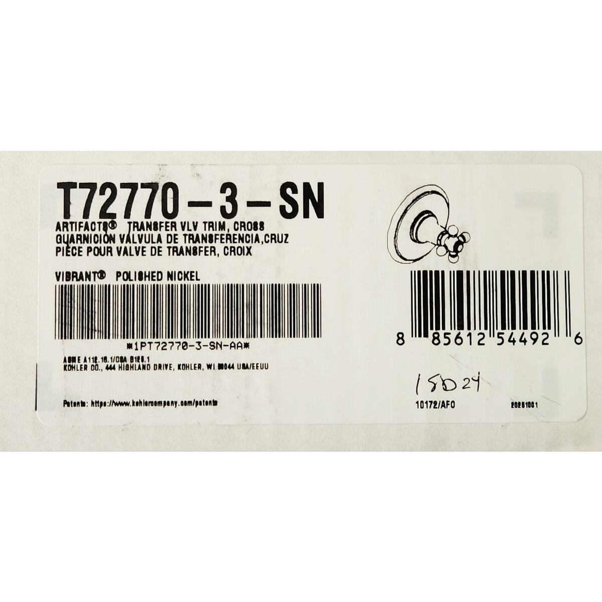 Kohler T72770-3-SN Artifacts MasterShower Transfer Valve Trim - Polished Nickel