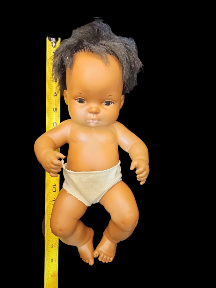 This doll features molded vinyl head and body with rooted black hair and brown eyes. Designed as a drink-and-wet model ? when given water, she wets as intended.