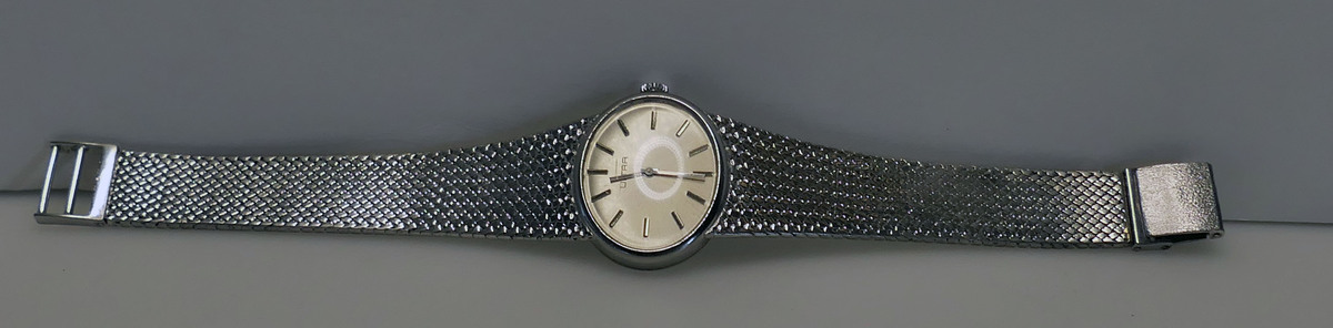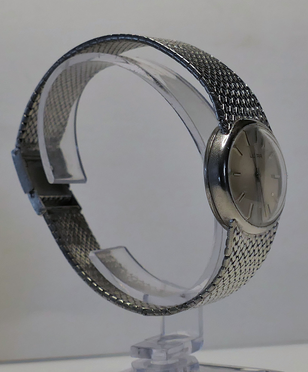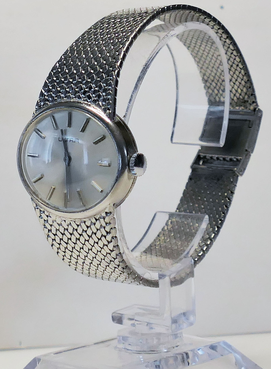 Elegant vintage ladies’ wristwatch by Ultra with a solid 935 silver case and matching mesh bracelet.
