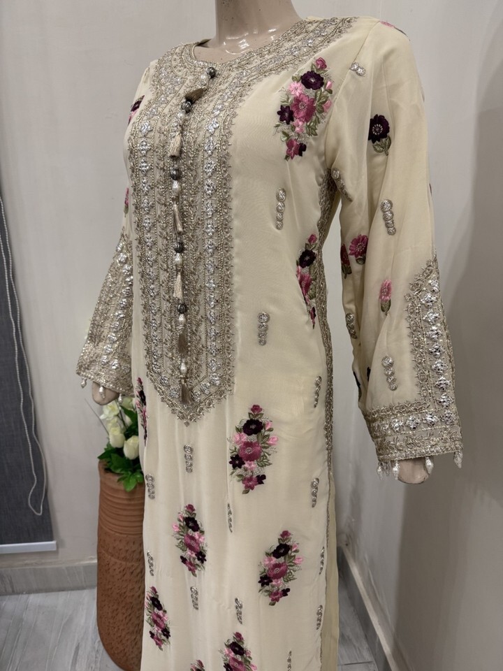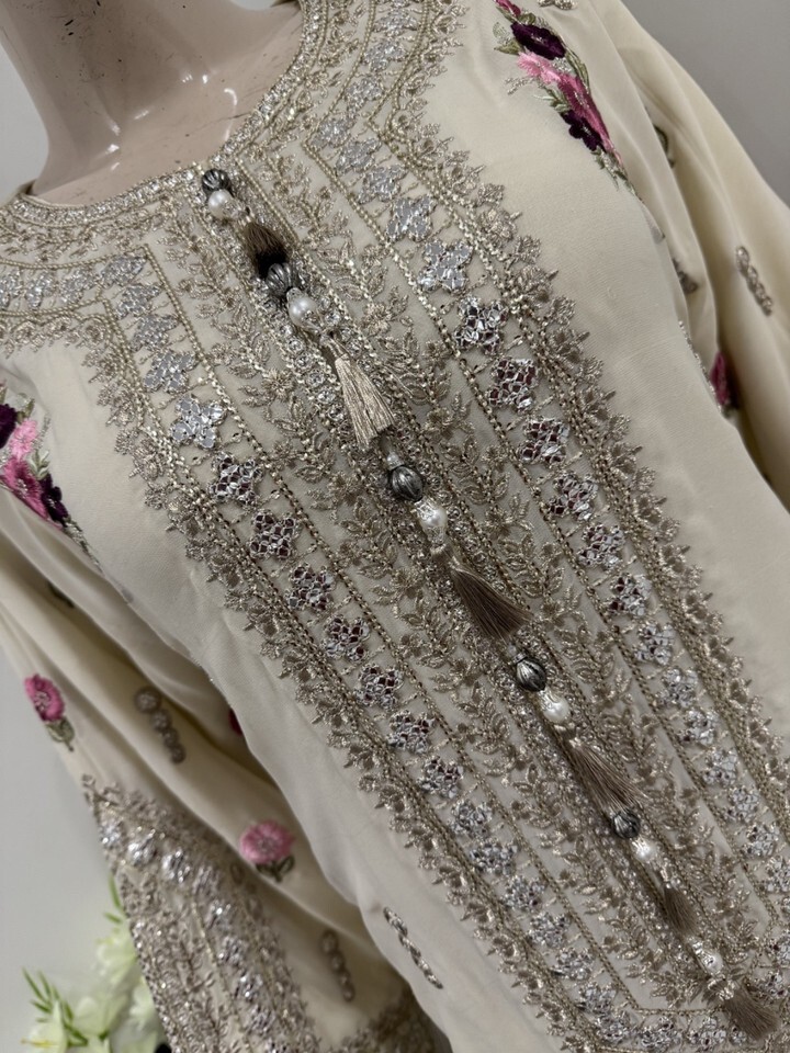 Pakistani Off White Fancy Chiffon Dress with embroidery & Squins work, XL
