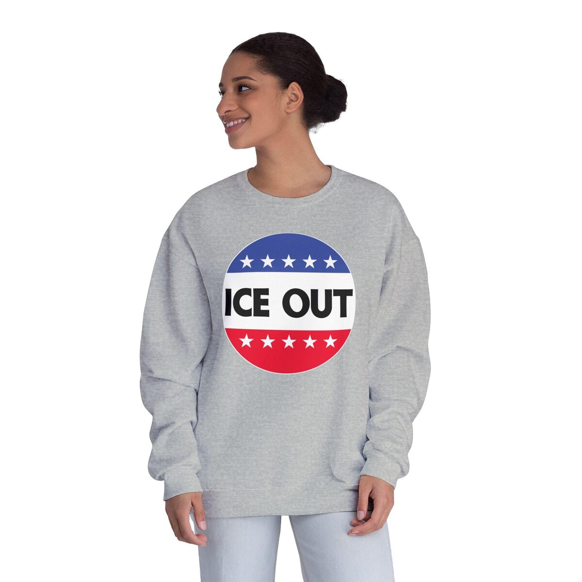 Product description: This crewneck sweatshirt carries a bold, political-satire graphic ? a red, white and blue roundel with stars and the words ?ICE OUT? across the center. It feels like a statement piece you can wear when you want your stance to be noticed without shouting. The medium-heavy NuBlend fleece holds its shape and prints clearly, so the graphic stays crisp wash after wash. Slip it on over a tee for marches, rallies, or neighborhood conversations. The fit is relaxed but structured: ribbed cuffs and hem bring the silhouette together, while the quarter-turned fabric and double-needle stitching mean this sweatshirt will keep looking straight and sturdy through frequent wear. Tear-away label and pre-shrunk fabric keep it comfortable against skin ? breathable, familiar, and ready to be part of your regular rotation when the topic comes up. This is for people who lean into visible commentary ? activists, organizers, politically engaged friends, or anyone who likes apparel that sparks talk. Wear it to canvassing days, civic events, or casual meetups where your views belong on sleeves and shoulders as much as in conversation. Product features - 50/50 NuBlend pre-shrunk fleece (medium-heavy 8.0 oz) for durability and comfort - Quarter-turned fabric to eliminate center crease for a clean look - 1x1 ribbed collar, cuffs and hem with spandex for stretch and a fitted finish - Double-needle stitched edges for long-lasting construction - Tear-away label and regular fit for everyday comfort Care instructions - Machine wash: cold (max 30C or 90F) - Do not bleach - Tumble dry: low heat - Iron, steam or dry: low heat - Do not dryclean
