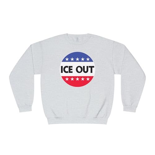 Product description: This crewneck sweatshirt carries a bold, political-satire graphic ? a red, white and blue roundel with stars and the words ?ICE OUT? across the center. It feels like a statement piece you can wear when you want your stance to be noticed without shouting. The medium-heavy NuBlend fleece holds its shape and prints clearly, so the graphic stays crisp wash after wash. Slip it on over a tee for marches, rallies, or neighborhood conversations. The fit is relaxed but structured: ribbed cuffs and hem bring the silhouette together, while the quarter-turned fabric and double-needle stitching mean this sweatshirt will keep looking straight and sturdy through frequent wear. Tear-away label and pre-shrunk fabric keep it comfortable against skin ? breathable, familiar, and ready to be part of your regular rotation when the topic comes up. This is for people who lean into visible commentary ? activists, organizers, politically engaged friends, or anyone who likes apparel that sparks talk. Wear it to canvassing days, civic events, or casual meetups where your views belong on sleeves and shoulders as much as in conversation. Product features - 50/50 NuBlend pre-shrunk fleece (medium-heavy 8.0 oz) for durability and comfort - Quarter-turned fabric to eliminate center crease for a clean look - 1x1 ribbed collar, cuffs and hem with spandex for stretch and a fitted finish - Double-needle stitched edges for long-lasting construction - Tear-away label and regular fit for everyday comfort Care instructions - Machine wash: cold (max 30C or 90F) - Do not bleach - Tumble dry: low heat - Iron, steam or dry: low heat - Do not dryclean