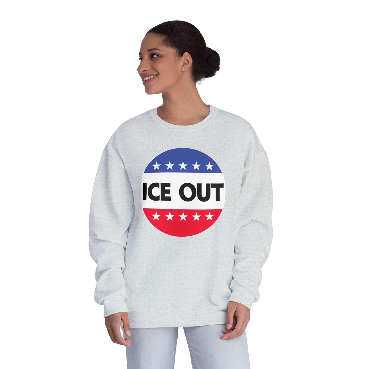 Product description: This crewneck sweatshirt carries a bold, political-satire graphic ? a red, white and blue roundel with stars and the words ?ICE OUT? across the center. It feels like a statement piece you can wear when you want your stance to be noticed without shouting. The medium-heavy NuBlend fleece holds its shape and prints clearly, so the graphic stays crisp wash after wash. Slip it on over a tee for marches, rallies, or neighborhood conversations. The fit is relaxed but structured: ribbed cuffs and hem bring the silhouette together, while the quarter-turned fabric and double-needle stitching mean this sweatshirt will keep looking straight and sturdy through frequent wear. Tear-away label and pre-shrunk fabric keep it comfortable against skin ? breathable, familiar, and ready to be part of your regular rotation when the topic comes up. This is for people who lean into visible commentary ? activists, organizers, politically engaged friends, or anyone who likes apparel that sparks talk. Wear it to canvassing days, civic events, or casual meetups where your views belong on sleeves and shoulders as much as in conversation. Product features - 50/50 NuBlend pre-shrunk fleece (medium-heavy 8.0 oz) for durability and comfort - Quarter-turned fabric to eliminate center crease for a clean look - 1x1 ribbed collar, cuffs and hem with spandex for stretch and a fitted finish - Double-needle stitched edges for long-lasting construction - Tear-away label and regular fit for everyday comfort Care instructions - Machine wash: cold (max 30C or 90F) - Do not bleach - Tumble dry: low heat - Iron, steam or dry: low heat - Do not dryclean