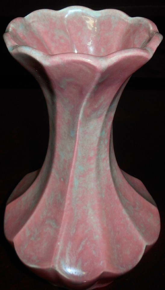 This is a pair of 8 1/2" tall vases that have an interesting mottled pink and turquoise color from the 1920s and KTK - Made in California. They are paneled in the center and as the panels near the mouth of the vase they have a slight twist and they have a great shape - they appear to be hand thrown as they are slightly different. They are both in good condition with no chips or cracks - has the incised mark on the base of each one: KTK Calif 505.