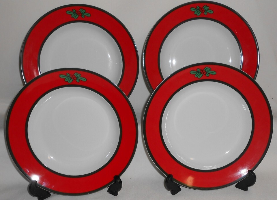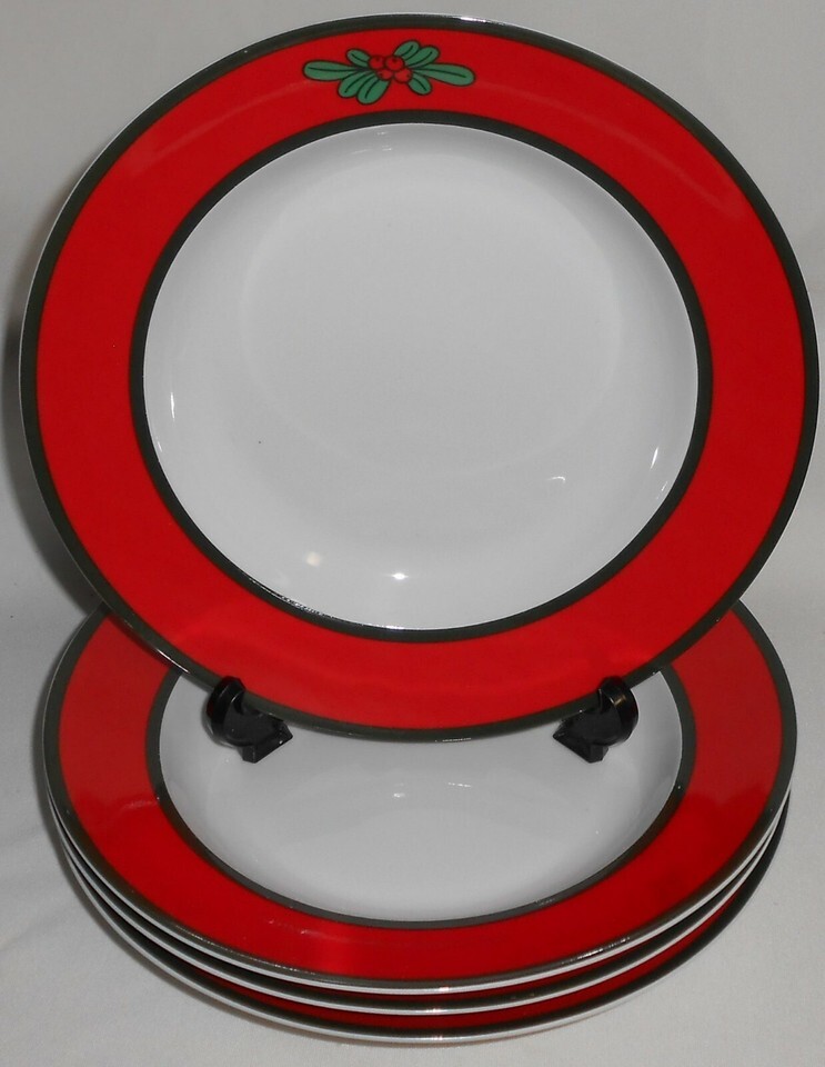 This is a Set of (4) Holiday - Christmas 8 3/4" Rimmed Soup Bowls with a Mistletoe Pattern from IKEA and Made in Portugal. They are all in good pre-owned condition with no chips or cracks.