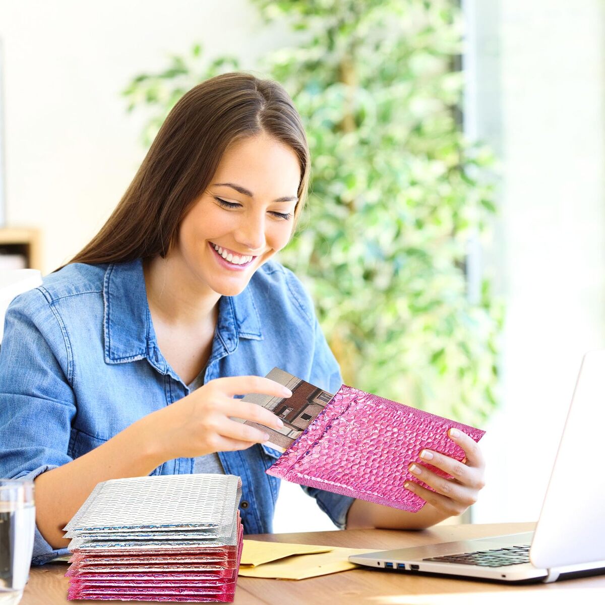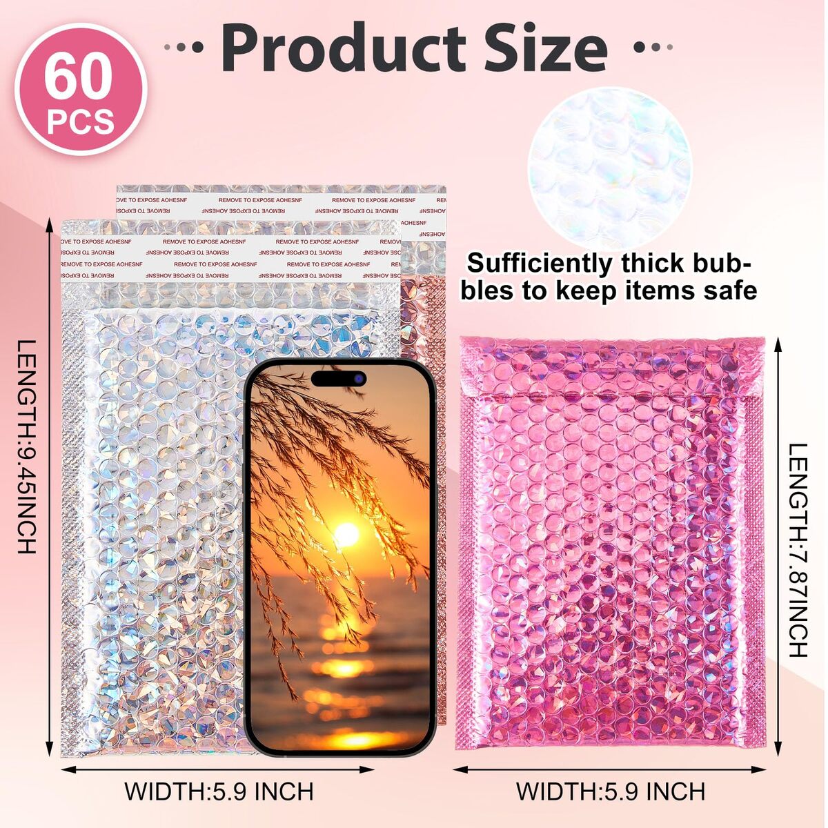 What You Can Get: you will receive 60 pieces of holographic bubble mailers in 3 different colors, including rose pink, pink and silver, and each color you will receive 20 pieces of bubble mailers; Large quantities can meet your various needs, and you can also share them with your friends and family,Appropriate Size: the holographic padded envelopes measures about 5.91 inches/ 15 cm in width and 7.87 inches/ 20 cm in length, and the sealing part is about 1.57 inches/ 4 cm in length, which is big enough to hold many items, such as cellphone cases, pens, bracelets, notebooks and so on,Quality and Reliable: the shipping bags bubble mailers are made of quality PE, reliable and sturdy, not easy to break or deform, with padded wall construction, providing additional protection during transportation,Nice Protection Performance: the packing envelopes for shipping are self adhesive bag, easy and convenient to use, and the bubble mailers can keep items from water, dirt, oil, dust, sand and so on; Whether it's rain, snow, dust storms or other weather conditions, giving you a convenient using experience,Multiple Applications: these shipping bubble mailers can be applied in offices, homes, stores, schools; They are ideal for packing mobile phones, electronics, gifts, holiday orders, invitations and greeting cards, books, cosmetics, cosmetics, essential oils, jewelry, accessories and more