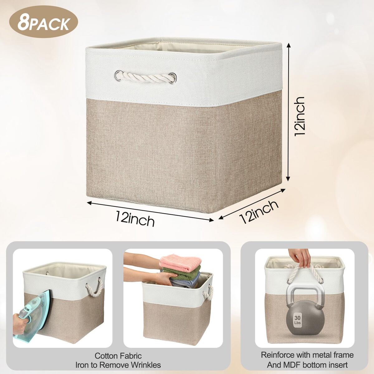 Sufficient Quantity: you will receive 8 pieces of closet baskets, which are enough to meet your various needs; You can apply them not only to hold your child's toys and books, but also to hold their diapers and clothes; If you can share them with your family and friends, they will be happy to receive such thoughtful gifts; Please note that this product is vacuum packaged, for better results, please blow it with a hair dryer after you get the product,Trustworthy Material: this rectangle storage basket is mainly made of linen fabric and polyester, which can let you feel soft and comfortable; The inner lining of the basket is made of polyester material, which is convenient for us to clean; Meanwhile, the handle design is convenient for us to grab and carry, not easy to hurt hands; Warm tips: the product is handmade, there may be odor, you can open the package and leave it for a while, the smell will be eliminated,Suitable Size and Foldable Design: the dimensions of these shelf baskets for organizing are about 12 x 12 x 12 inches/ 30.48 x 30.48 x 30.48 cm (L x W x H), which are not too big or too small to store and organize; At the same time, the foldable design is convenient for you to store when not in apply, saving space for you.Please pay attention to the size before purchasing,Diversified Scenario: these bins for closet organization can be applied to store sundries, books, toys, shoes, clothes, sheets, towels, covers and other items, and can also be taken to store pet food, cans and more; You can store them in your bedroom, bathroom, living room and more, or you can store them in your office for your work papers,Easy to Clean: this fabric storage bin has an advantage of easy to clean; If you accidentally make it dirty, you can wipe it gently with a dry cloth, or apply light soapy water for local cleaning; Please note that it is not machine washable as it is supported by a metal frame inside; Please Note: dimensions are provided as a close estimate and may vary slightly due to manufacturing or material variations