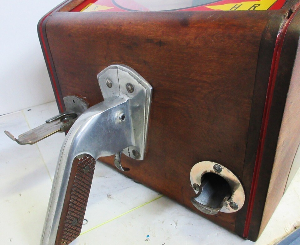 The Victor Vending Company made this baseball themed machine in 1949. You must have your finger on the trigger and be ready to swing the "bat" when you insert the coin because the ball of gum immediately comes towards home plate. Excellent original condition. Reference: "Silent Salesman Too" by Bill and Peggy Enes, page 195. Has key.