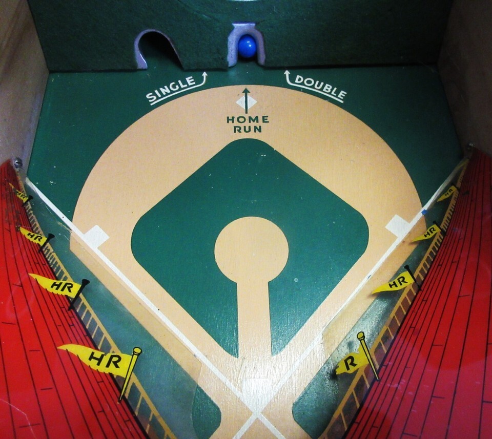 The trigger operated bat hits the ball through the air. The player receives a gumball for every penny except when a home run is made. The home run ball is displayed at the bottom of the target. The merchant awards the player for skill, then the ball is released and falls into the cash box for a record.