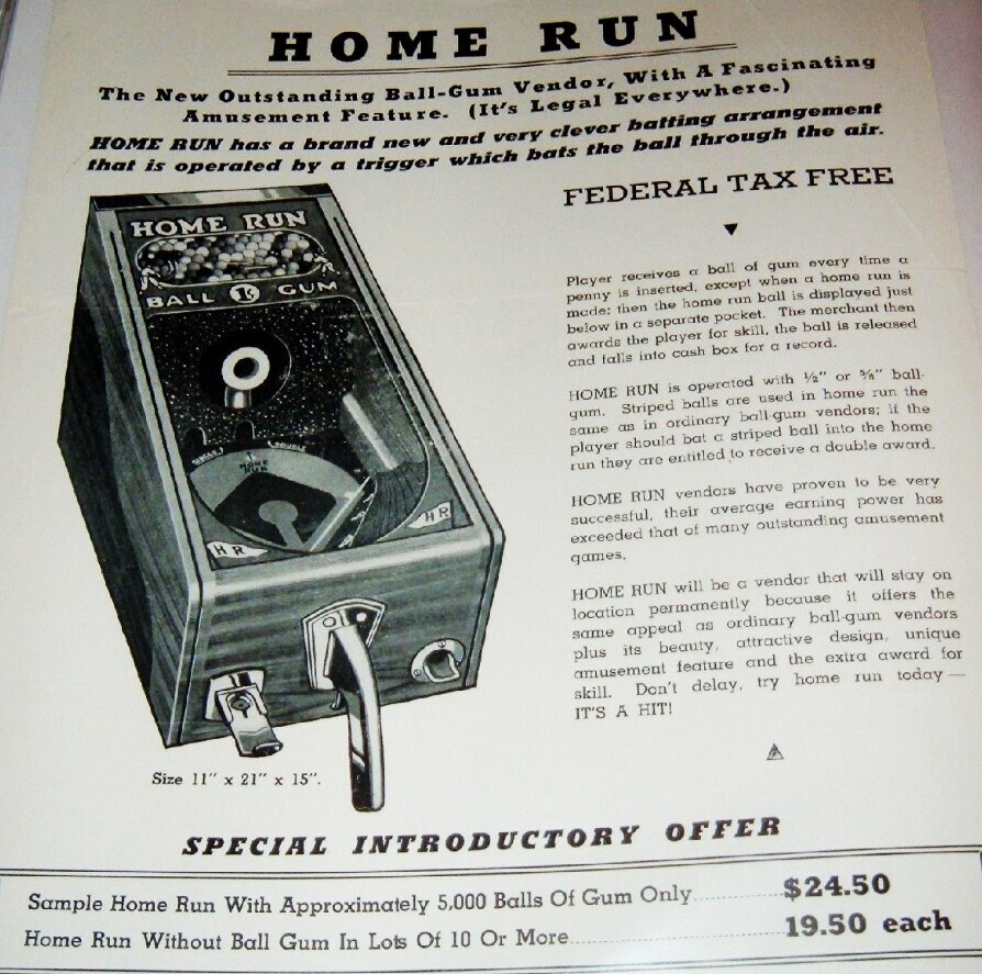 Home Run Baseball Skill 1c Gumball Skill Dispenser, circa 1947