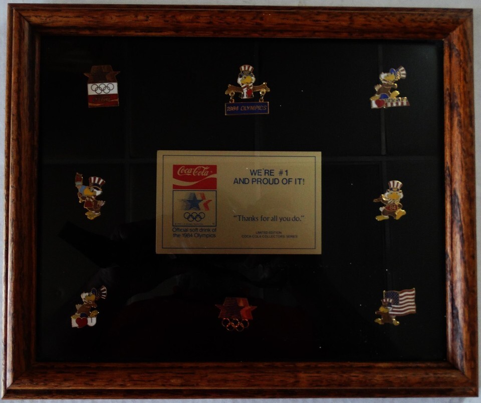1984 Los Angeles Olympics Coca Cola COKE 8-pin set in wood frame