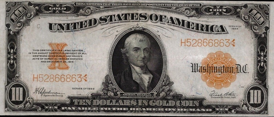 A complete collection of the 1922 Gold Certificates including a $10.00 gold certificate serial # H75132176 with President Michael Hillegas, a $20.00 gold certificate serial # K82634805 with President Washington, a $50.00 gold certificate serial # B4190213 with President Grant and a $100 gold certificate serial # N2123628 with President Benton.