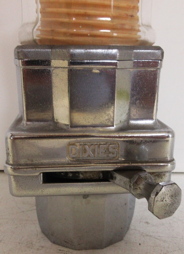 This vintage Dixie Glass Cup Holder Dispenser from the 1930s is a great addition to any collection. It features a chrome finish, lever and bracket, and can hold multiple cups. The design is perfect for soda enthusiasts and collectors alike. The item is an original and was made in the United States, adding to its value and authenticity. Whether you're a fan of vintage soda memorabilia or just looking for a unique piece to add to your collection, this Dixie Glass Cup Holder Dispenser is a must-have.