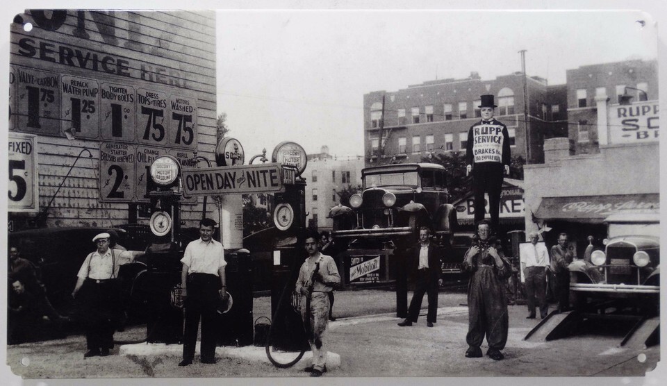 Open Day and Nite Mobil Oil Gas Auto Black and White Photograph on Metal Sign