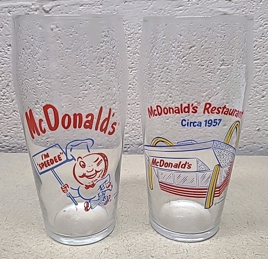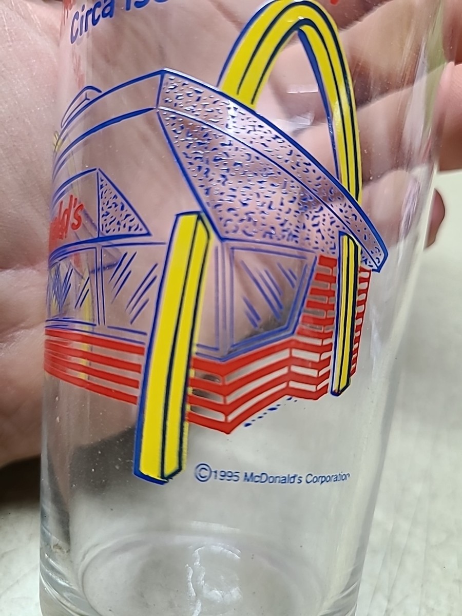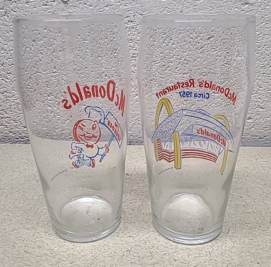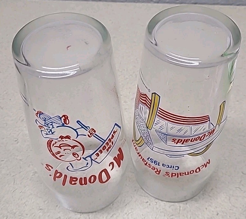 The product is a lot of 2 vintage McDonald's drinking glasses from 1995. These collectible glasses feature the iconic McDonald's brand and theme of restaurants and fast food. Perfect for fans of McDonald's memorabilia or collectors of vintage cups and mugs, these glasses offer a nostalgic glimpse into the past and are sure to be a unique addition to any collection.