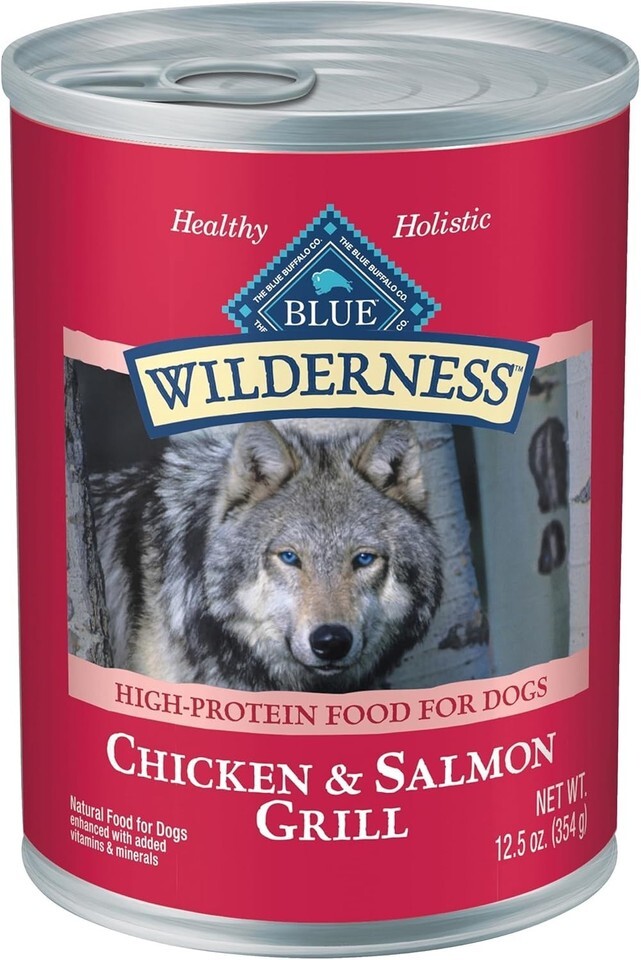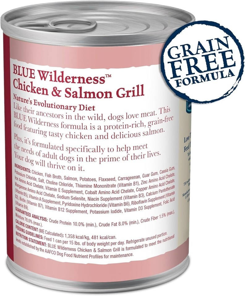 Contains: Twelve (12) 12.5-oz cans of BLUE Wilderness High Protein Natural Adult Wet Dog Food, Salmon Chicken Grill with Wholesome Grains.