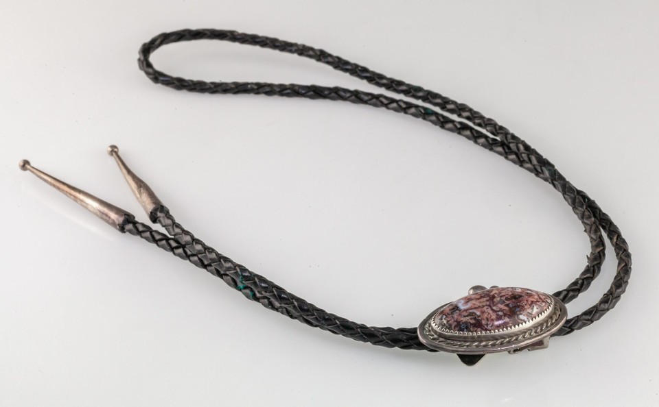 Authenticity Guarantee Sterling Silver Pink Agate Bolo Tie with Silver Aglet...