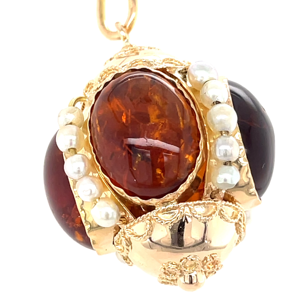 Beautiful vintage 14K solid yellow gold orb-style fob charm pendant, featuring four large Citine cabochons surrounded by clusters of small pearls. The charm has intricate goldwork and a bold design, giving it a luxurious and eye-catching appearance.