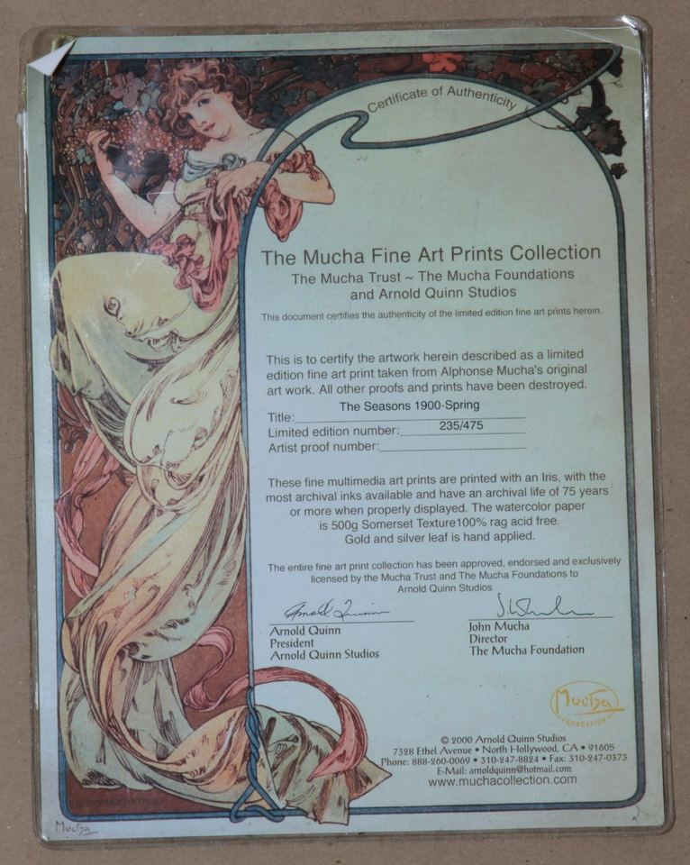 COA issued by The Mucha Trust / The Mucha Foundation Arnold Quinn Studios (North Hollywood, CA)