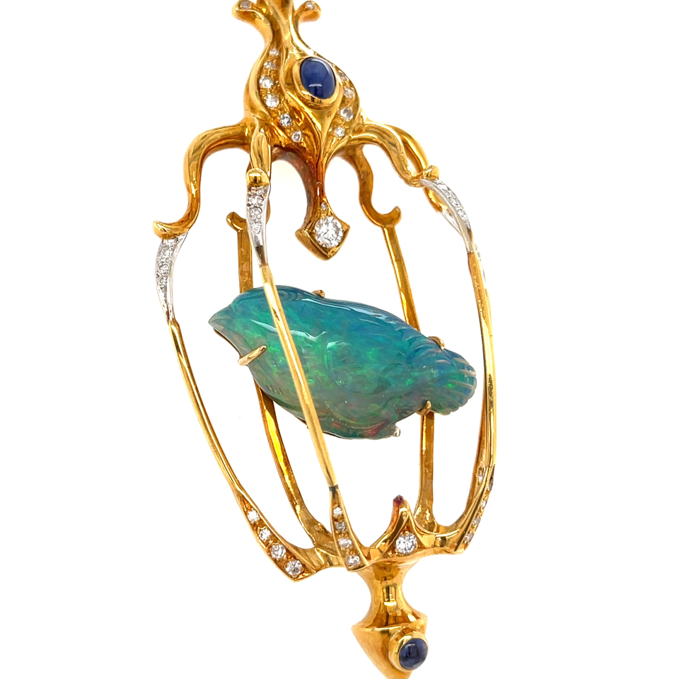 Balogh Carved Opal Star Sapphire Diamond 18k Yellow Gold Caged Bird Pendant