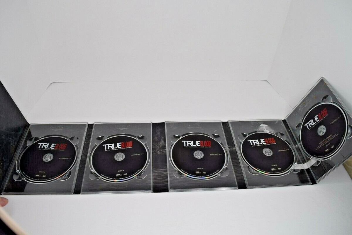 True Blood Seasons 1, 2, 3 Complete Season DVD Box Sets. All are the 5-disc Box sets. All are used in Good Condition. Some wear and slight spots of damage to the outside box. Disc are all good with some wear to some of the discs. All inserts are included. See all photos for details and condition. Will ship USPS Media Mail.