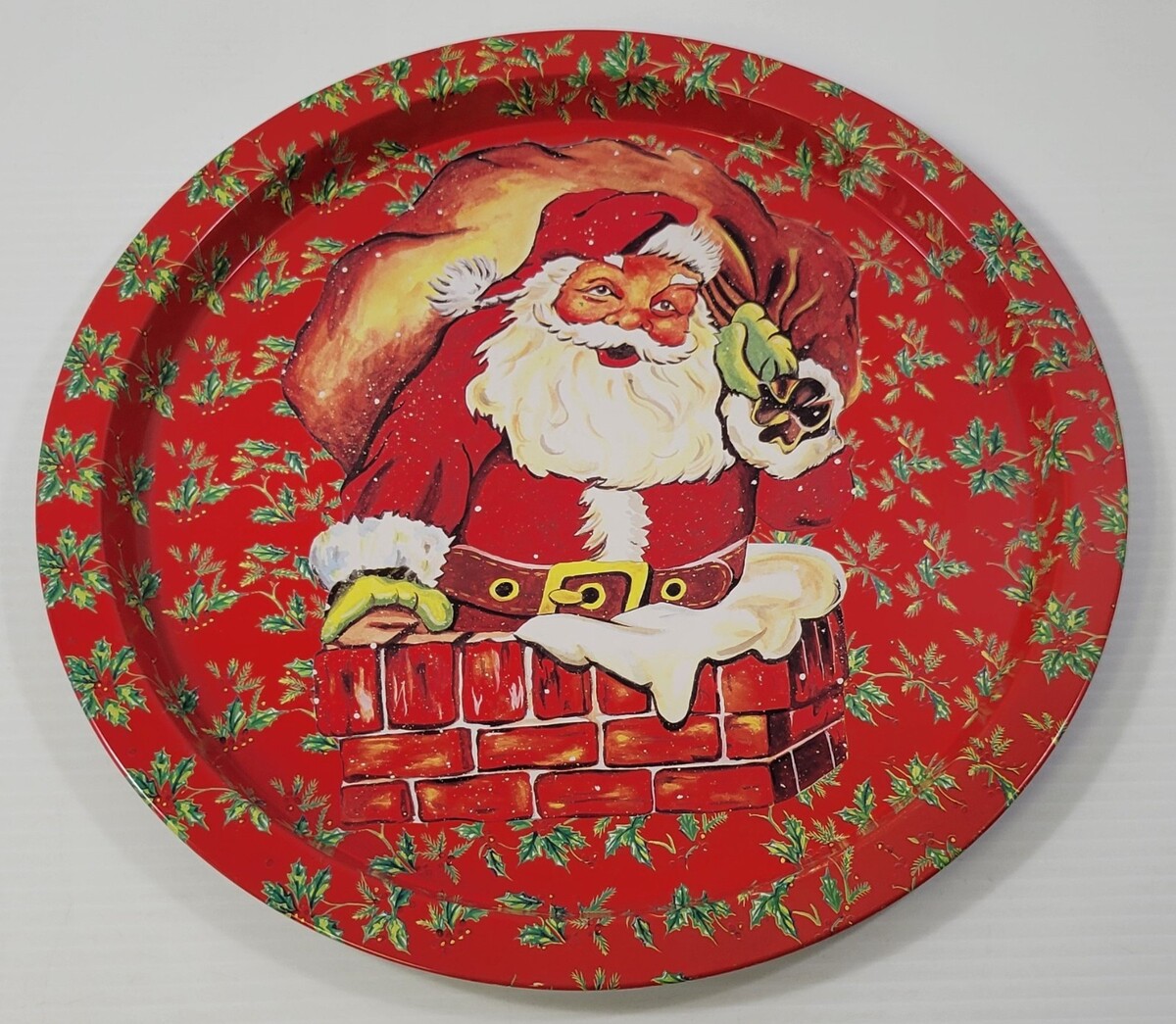 Y) Vintage Enesco Santa Claus Christmas Round Holiday Metal Tin Serving Tray 13"