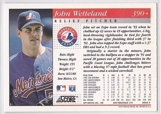 M) 1994 Score Baseball Trading Card - John Wetteland #390