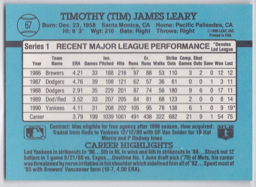M) 1991 Donruss Baseball Trading Card - Tim Leary #67