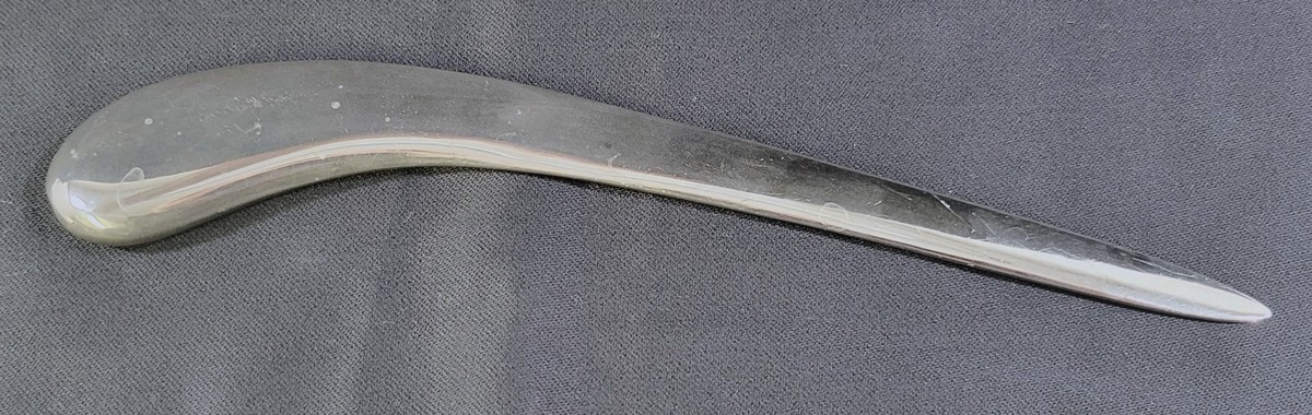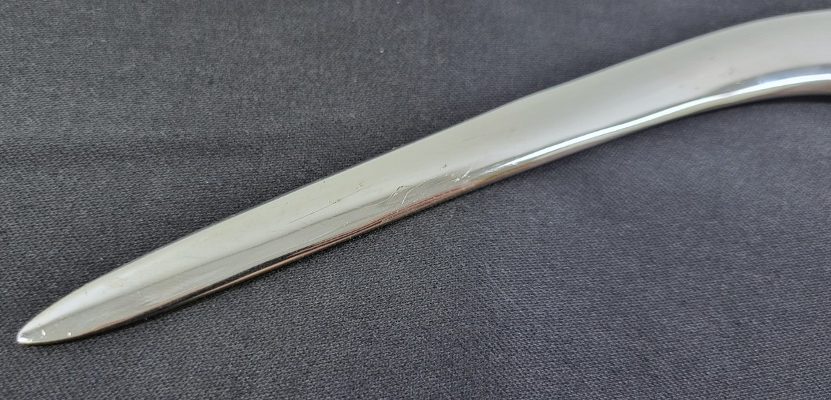 Letter opener is in used condition with signs of use and age including some scratches, scuffs, marks and tarnish to the metal.