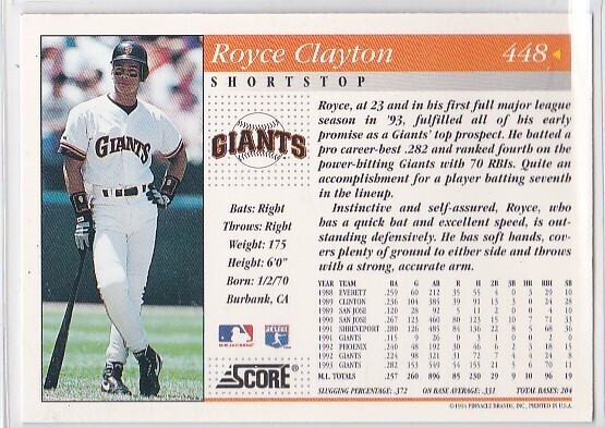 M) 1994 Score Baseball Trading Card - Royce Clayton #448