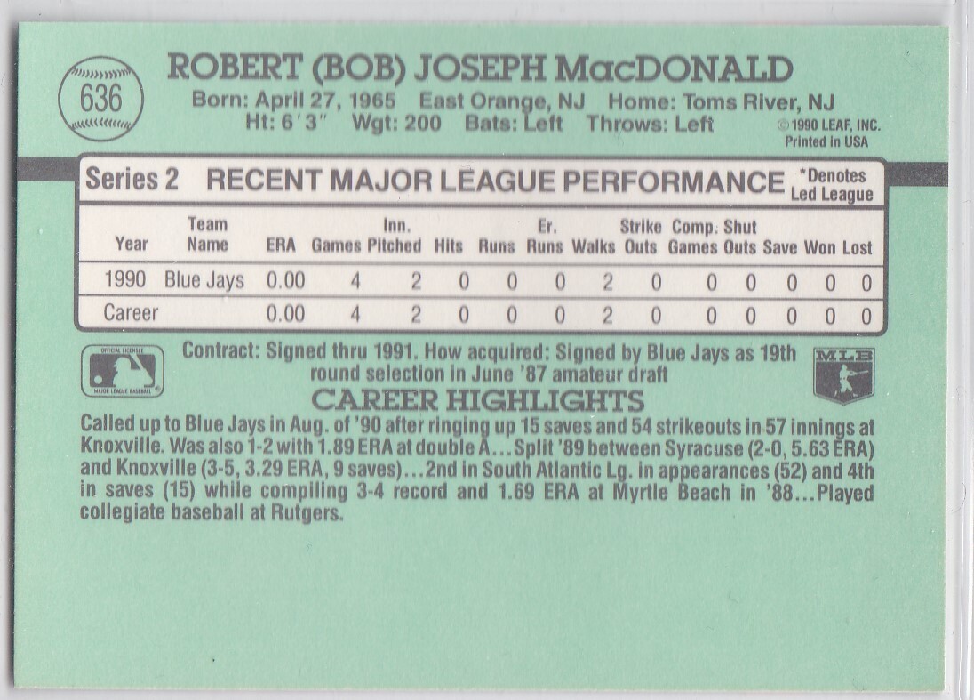 M) 1991 Donruss Baseball Trading Card - Bob MacDonald #636