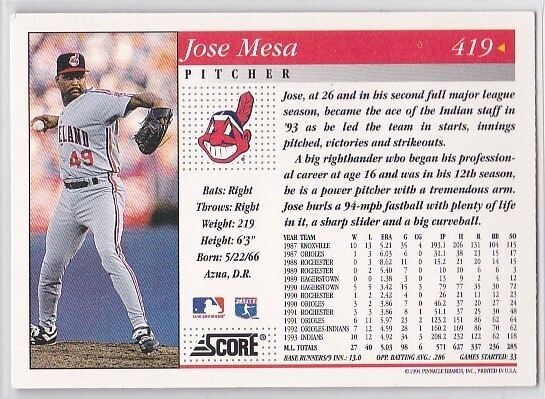 M) 1994 Score Baseball Trading Card - Jose Mesa #419