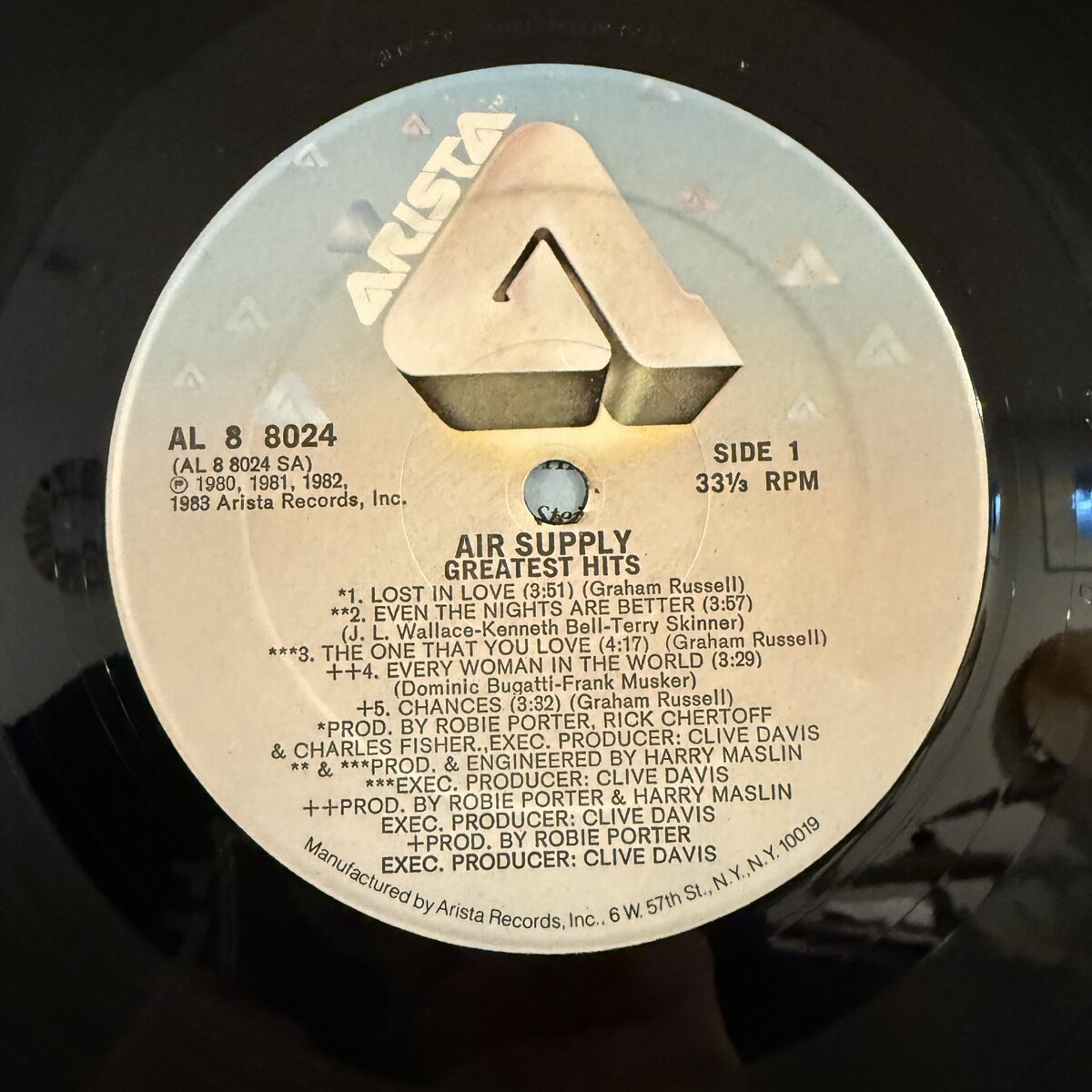 Air Supply Greatest Hits Vinyl LP Arista AL 8 8024 Lost In Love All Out of Love