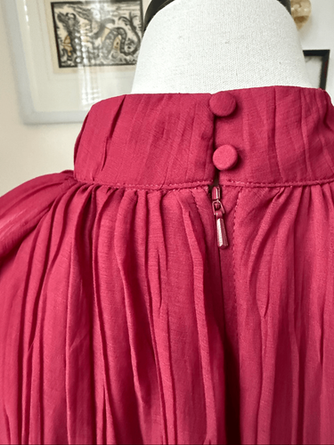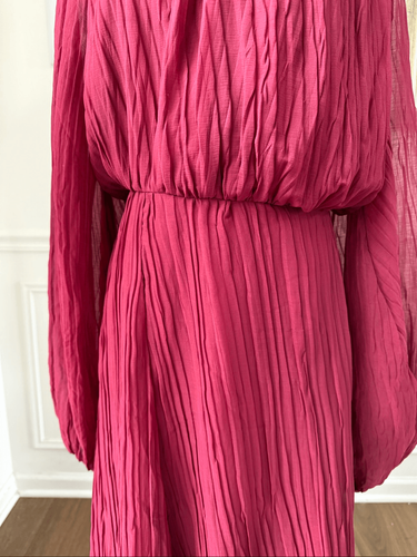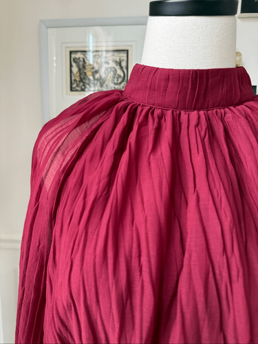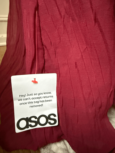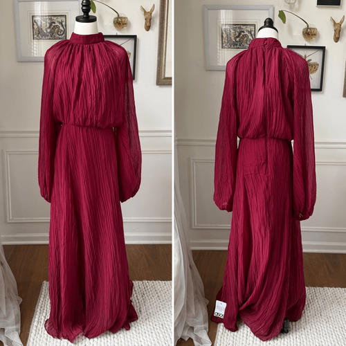 New without tags, ASOS DESIGN high neck crinkle maxi dress with blouson sleeve in deep berry. To me the color looks a little more burgundy than berry. This dress does not have the price tag on it anymore, but it does have the return tag hanging off one side and the dress cannot be returned without it. So it wasn?t worn. And the inside care tag also has a baggie with additional threading, etc. attached