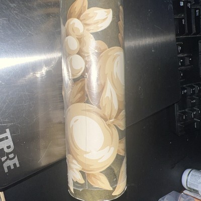 One new roll of wallpaper Seabrook Designs. Purple, green, gold, tan colors. Looks like pears, grapes, and stripes are the theme. I think the pattern model number is 182093 but some of the numbers are rubbed off the label. I think this paper is from the late 1980s? not sure! Caution with details. The plastic is coming off the edge of the paper on one side so there?s a little bit of