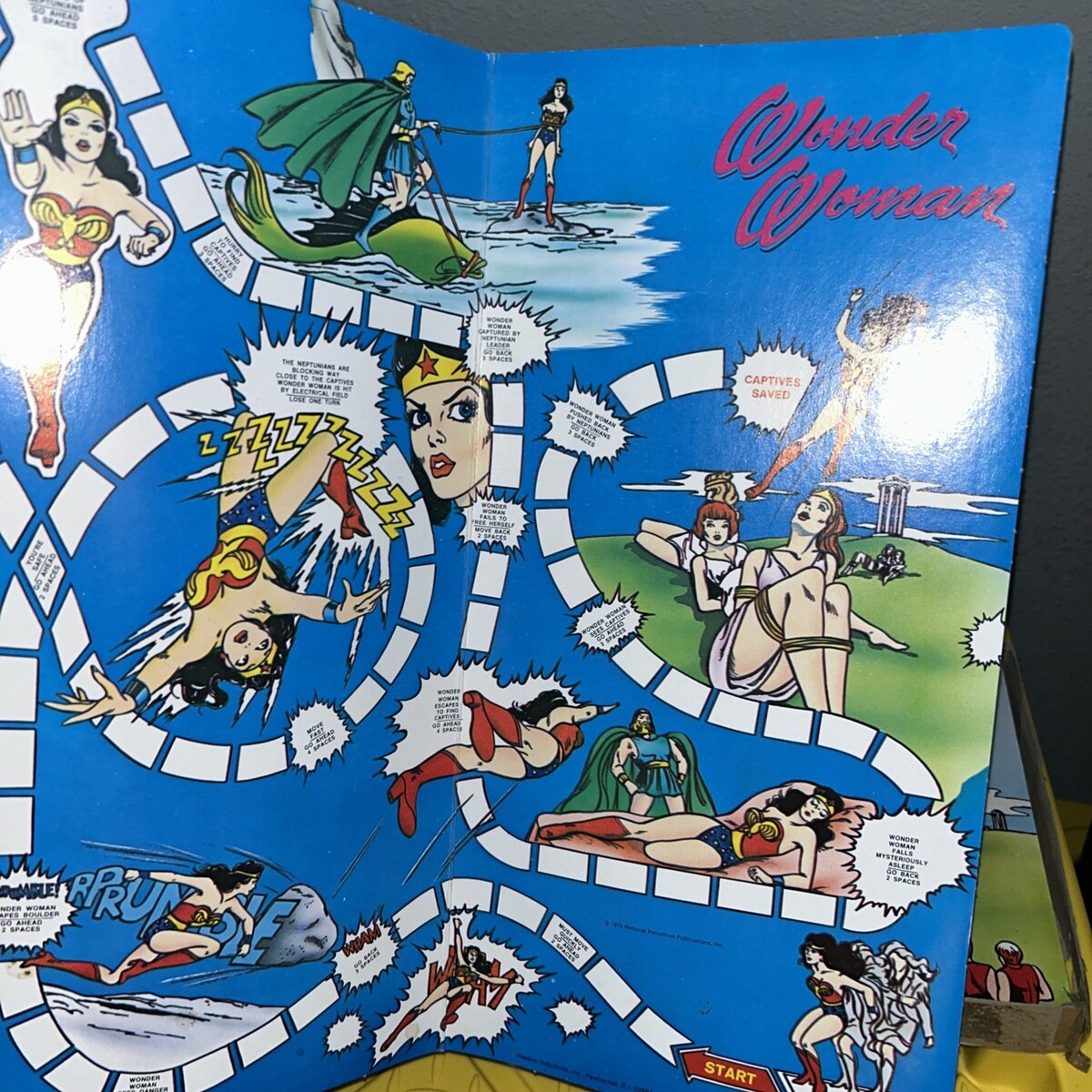 Wonder Woman game has 2/4 pieces, spinner, and board.