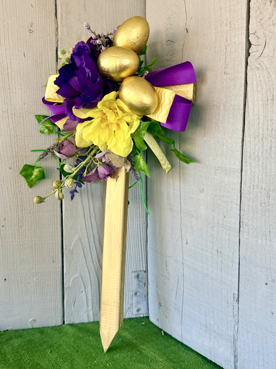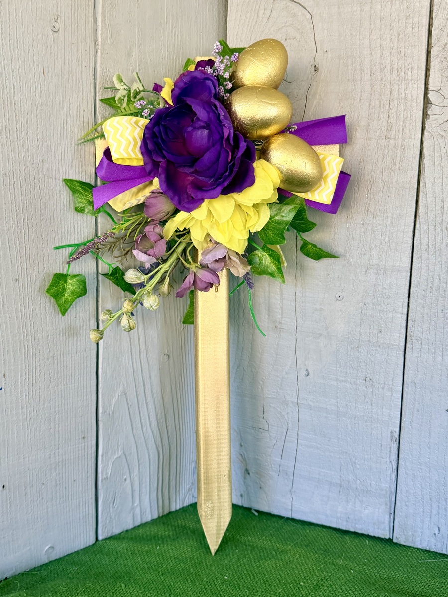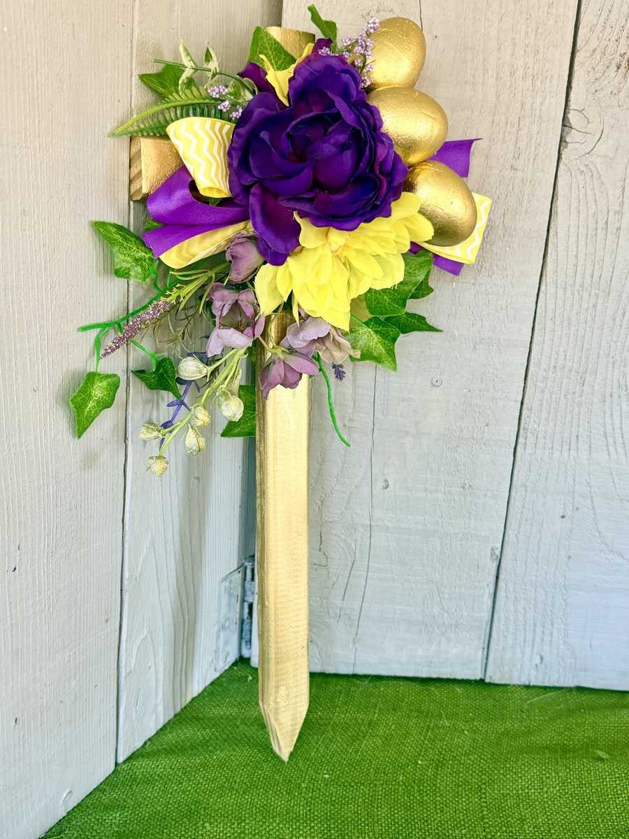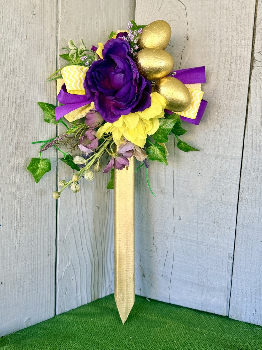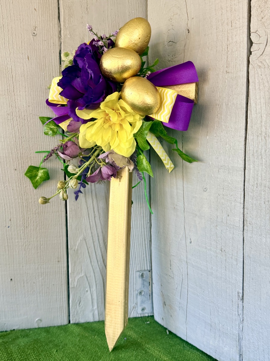 This 18” rustic pine cemetery cross has been painted gold with a large purple peony, yellow mum, layers of greenery, purple wildflowers, three gold Easter eggs, purple ribbon, and yellow and white floral ribbon.