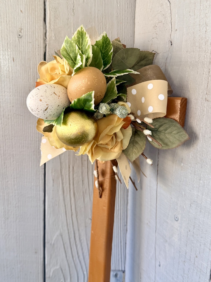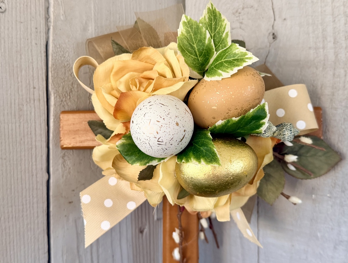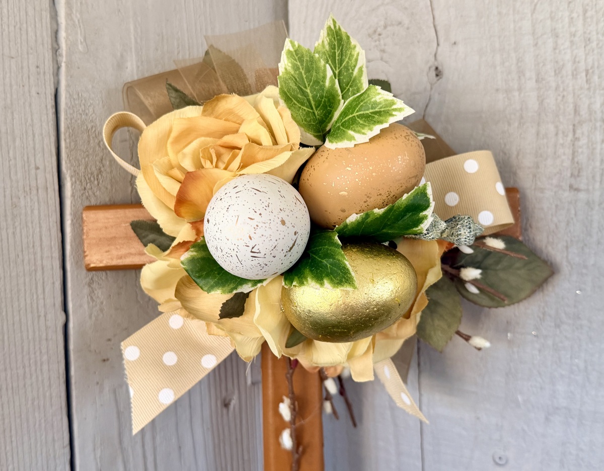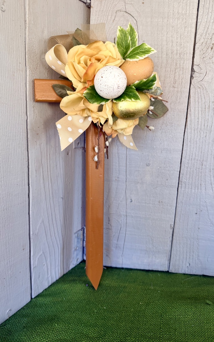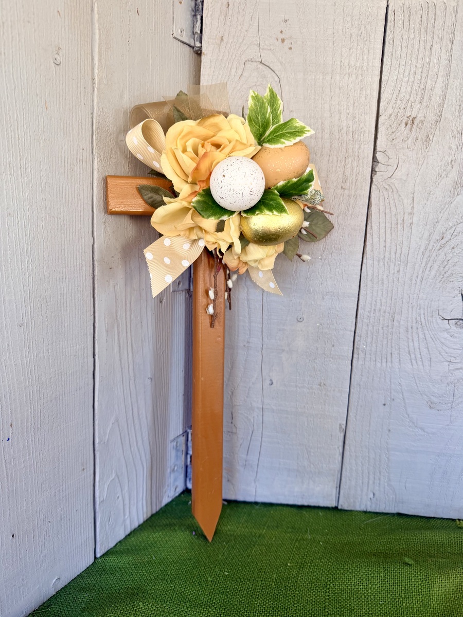 This 18” rustic pine cemetery cross has been painted brown with three pale yellow roses, three Easter eggs in cream, brown, and gold colors, pussy willows, layers of greenery, sheer gold ribbon, and tan /white polka dot ribbon.