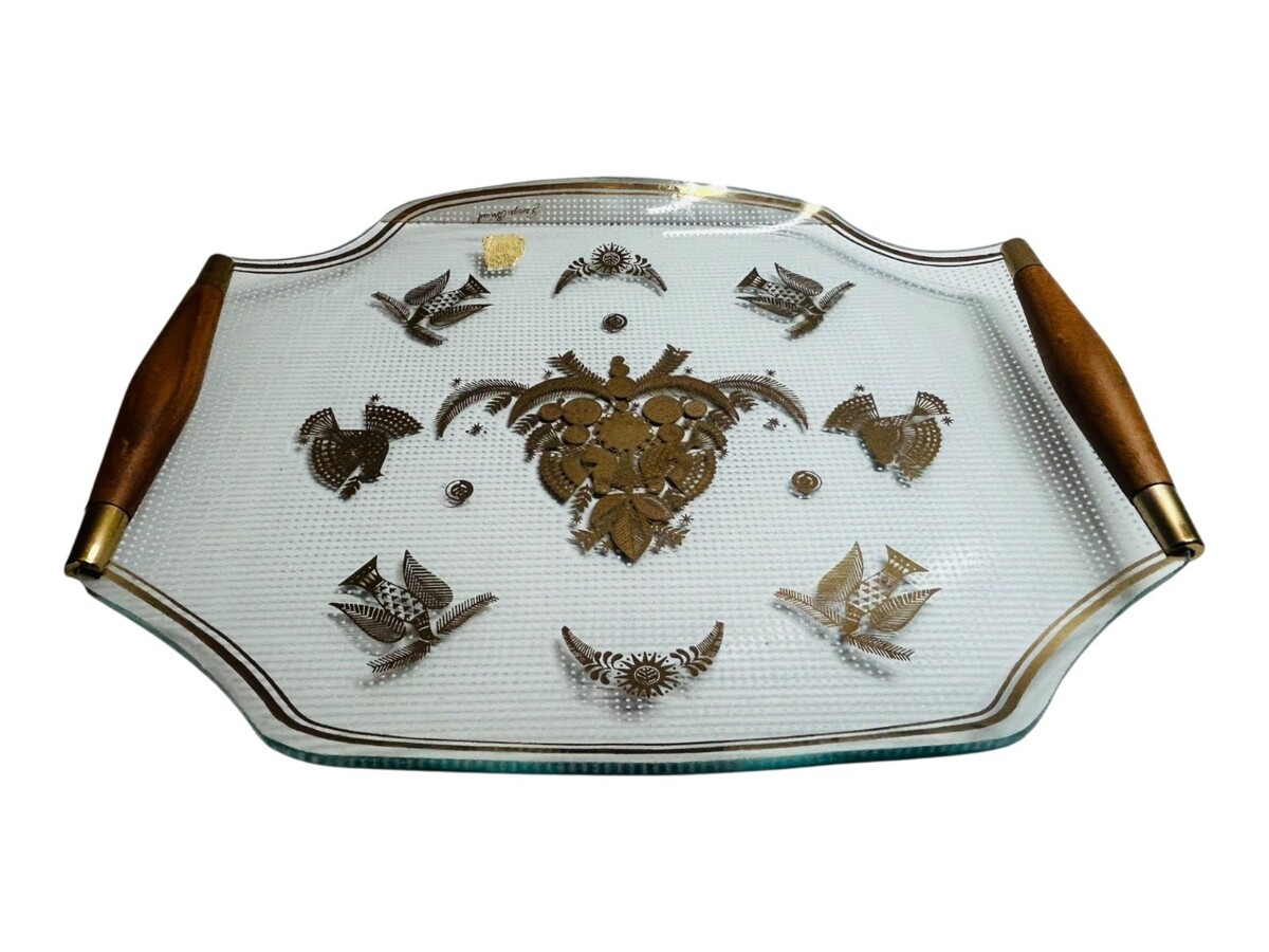 Georges Briand Glass Guild Tray Gold Bird MCM Wood Handles 12x10 Vintage