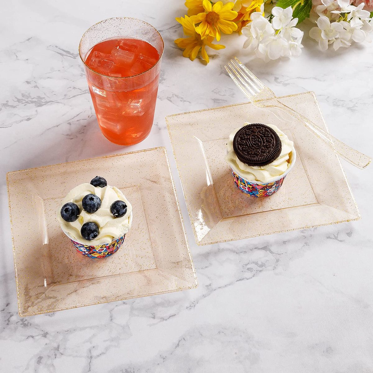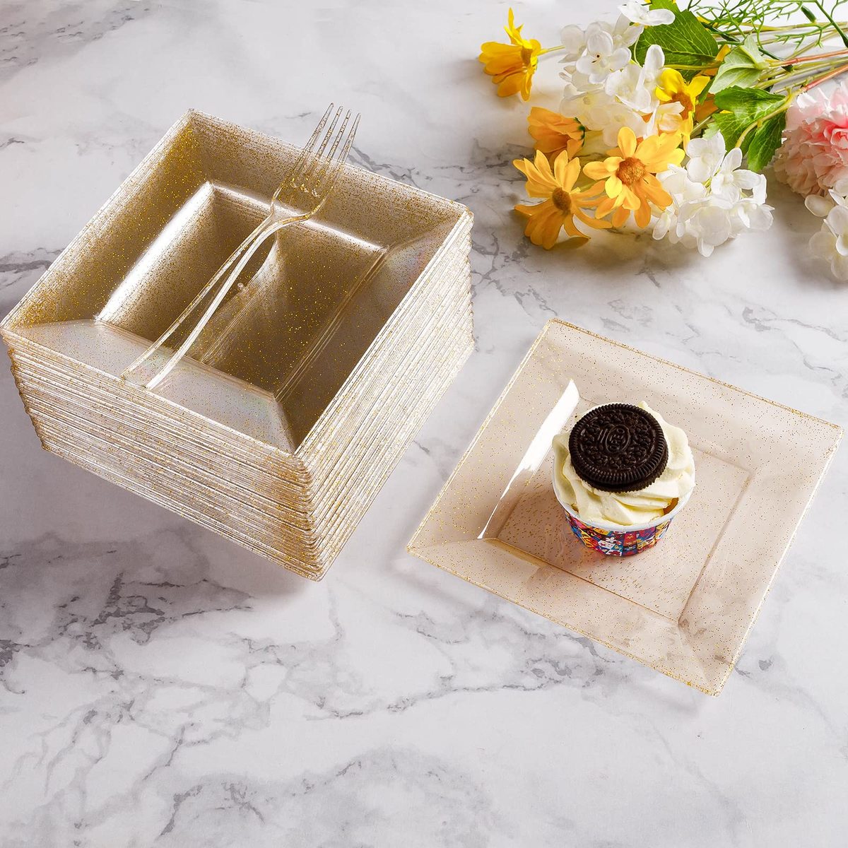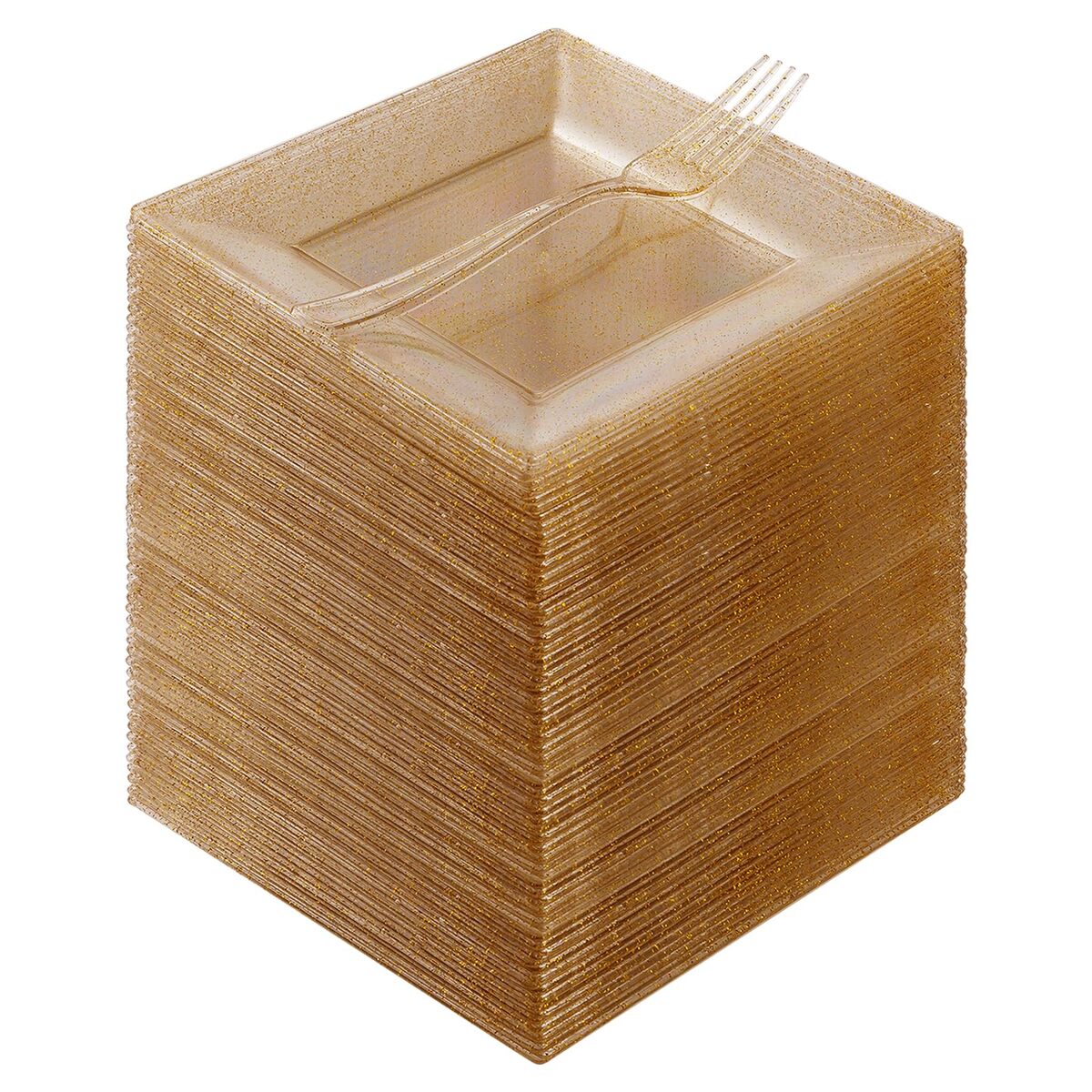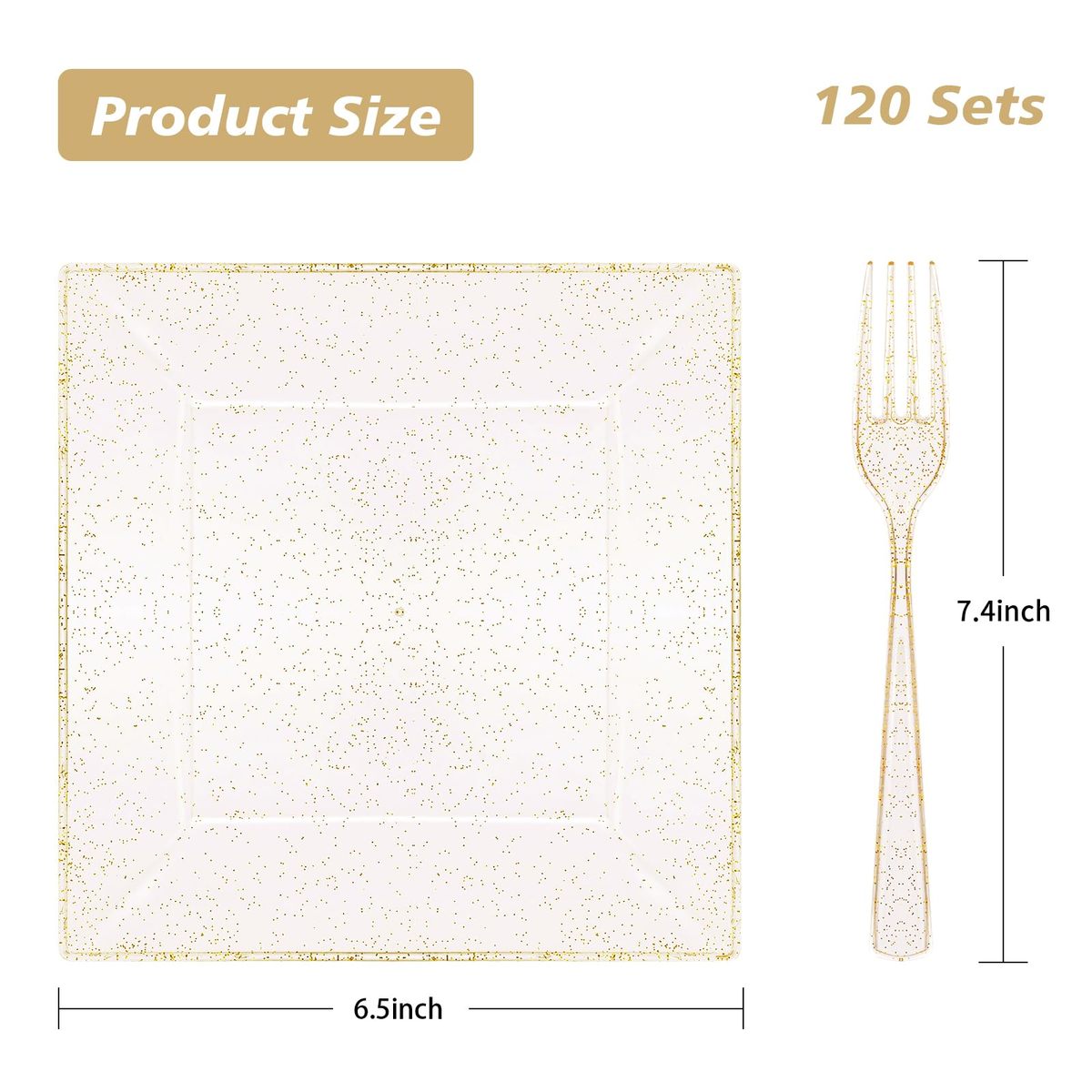 100% BPA Free - The disposable plates for party are made of food-grade, reusable plastic that is BPA-free. If you need to reuse the plates, simply wash them with water. NOTE: Plastic plates for party are not recommended for use in the microwave or dishwasher.,ELEGANT DESIGN - Square dessert plates with dessert forks are ideal for serving appetizers, wedding cakes, salads and desserts, snacks, and fruit salads. The clear and gold glittering design of the plates can be matched with a variety of colored dinnerware for all occasions.,IDEAL FOR PARTIES - With mini dessert plates, you can easily host a party without worrying about clean-up at the end. You can throw them in the trash after use. These dessert plates are great for weddings, holidays, baby showers, business parties, Thanksgiving, Halloween, and Christmas dining.,STURDY DURABLE - The heavy-duty gold glitter plates are made of hard plastic and are thick enough to hold any food. The glittering gold plates will not scratch easily and can easily handle hot, cold, and wet food without leaks or spills.,WHAT'S YOU GET - A convenient 240PCS that includes 120 x 6.5" square dessert plates and 120 x 7.4" plastic forks. Our disposable plates ensure a hassle-free post-party experience, freeing you to savor moments with family and friends instead of worrying about cleanup.