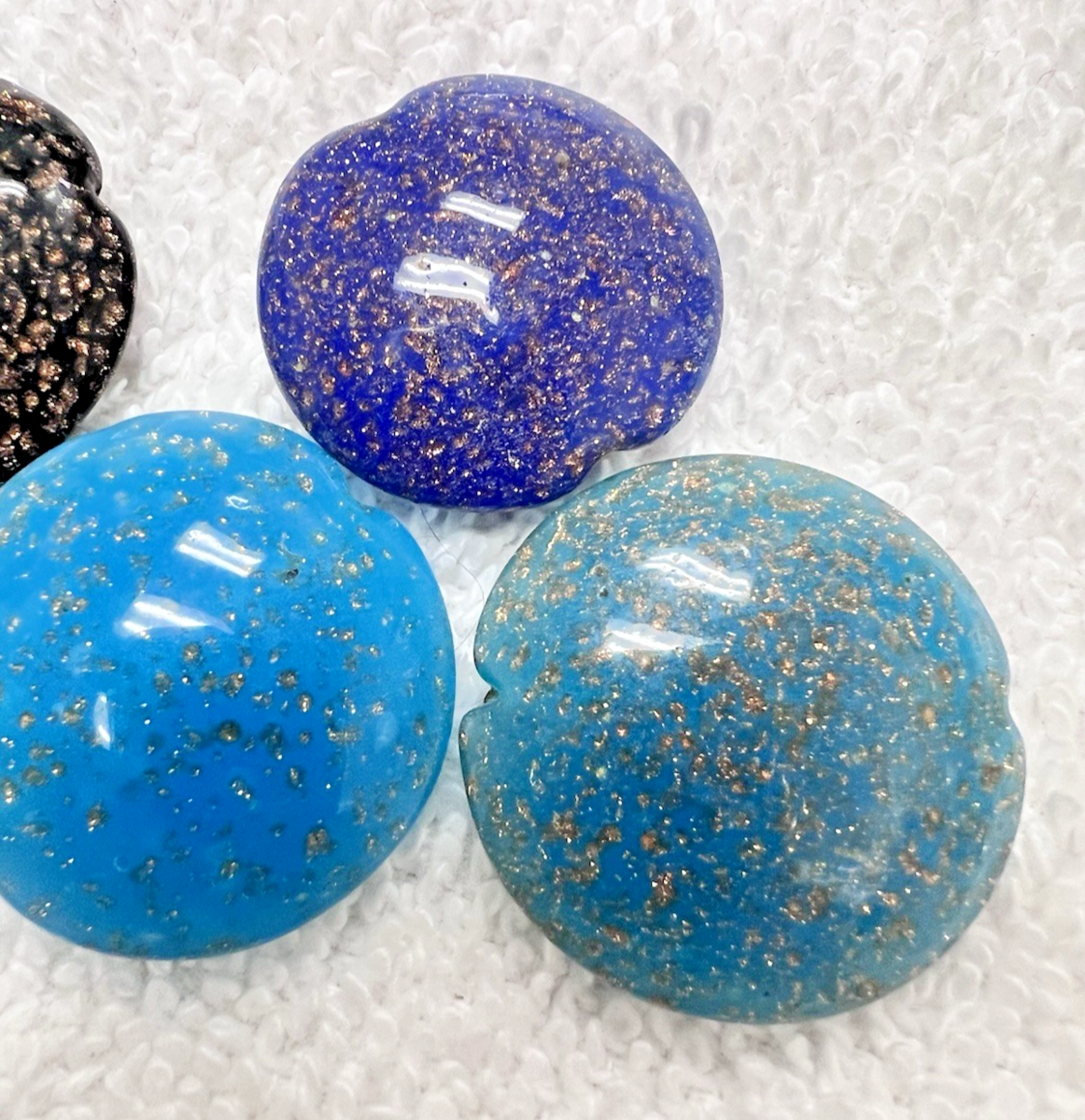 5 Vintage Venetian Glass Beads 1 in Round Flat Blue Green Black w Gold Flecks