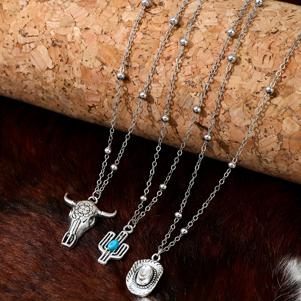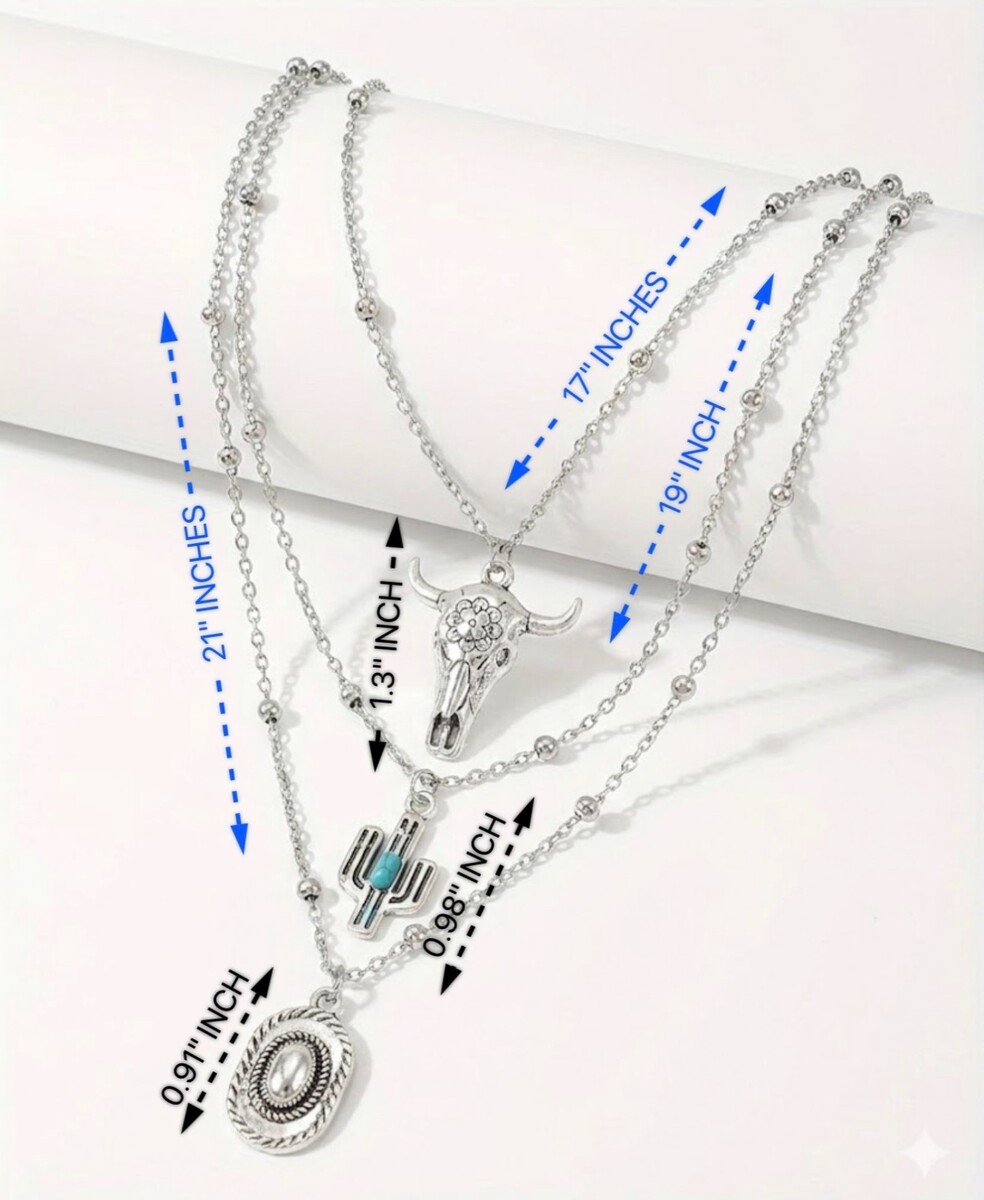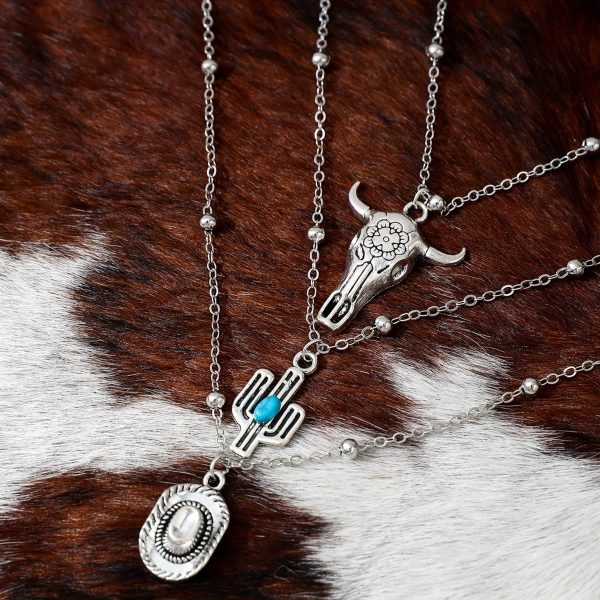 boho necklace, western necklace, cowgirl jewelry, rodeo necklace, layered necklace set, bull skull necklace, cactus necklace, turquoise cactus pendant, country western jewelry, southwest jewelry, festival jewelry, Nashville outfit, yeehaw jewelry, boho chic necklace, rustic western style, cowgirl aesthetic, rodeo cowgirl necklace, ranch girl style, country concert outfit, statement necklace set, bohemian jewelry, desert style necklace, gypsy boho necklace, western charm necklace, layered chains jewelry, bull skull pendant, cactus charm jewelry, concho necklace, silver layered necklace, three layer necklace, cowgirl charm, rodeo girl charm, cowgirl aesthetic, cowgirl hat charm, cowgirl cosplay.