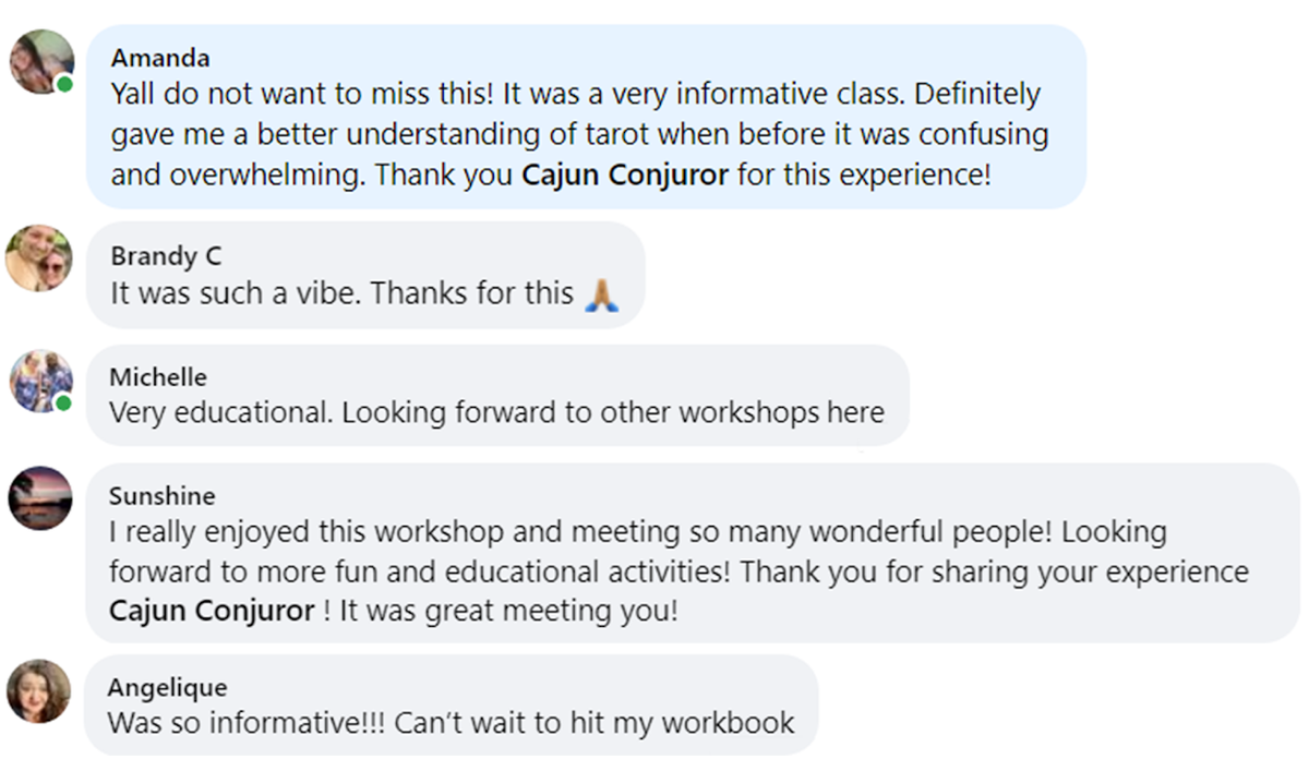 Bring a fully developed, professionally structured tarot workshop to your venue or private group. For a flat rate of $400 (up to 16 participants), you receive a complete 2-hour immersive learning experience designed specifically for beginners, along with comprehensive educational materials that extend far beyond the event itself. Louisiana, southeast Texas, and southwest Mississippi ONLY.